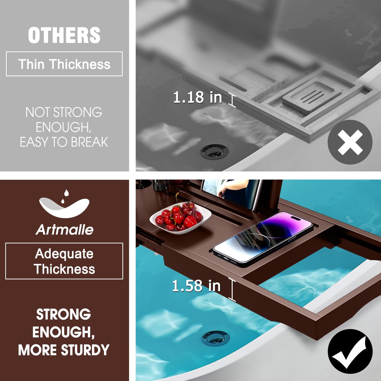 - 💟IDEAL GIFTS - Artmalle luxury bamboo bathtub caddy tray table is a unique and practical gift that not only provides convenient bathroom storage, but also adds a natural and cozy atmosphere to the bathroom. Whether it's a birthday gift, a wedding souvenir, a housewarming gift or a holiday gift, a bamboo bathtub tray can bring surprise and joy to the recipient.