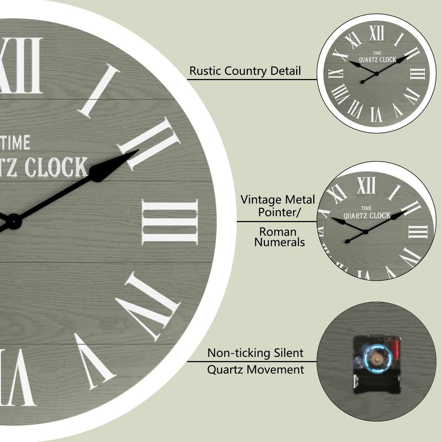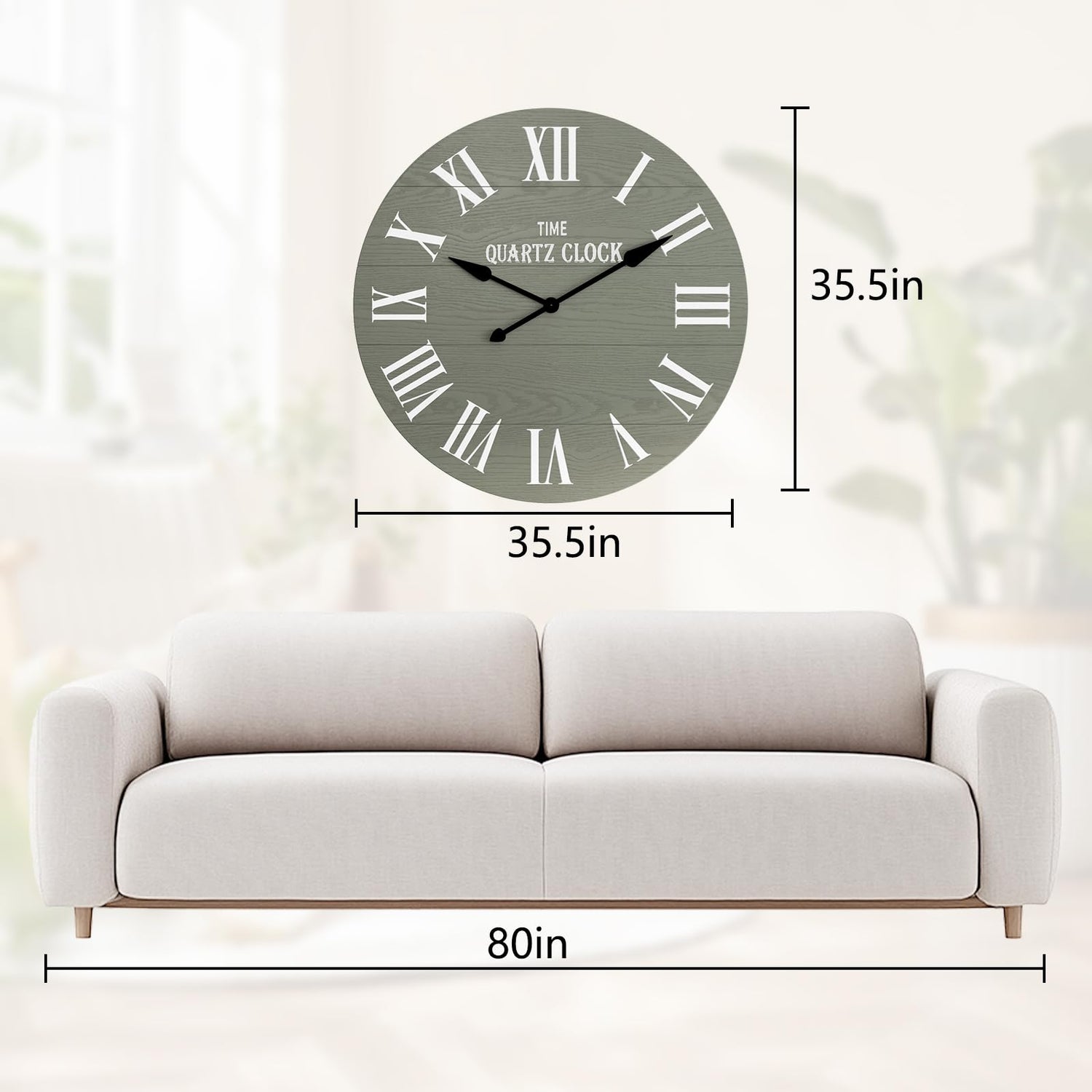 ARTPOWER Large Farmhouse Wall Clock, 35.5” Shiplap Wall Clock with Roman Numeral, Nearly Non-Ticking, Round Wall Clocks for Living Room Decor, Office, Bedroom, Entrance, Sage Green