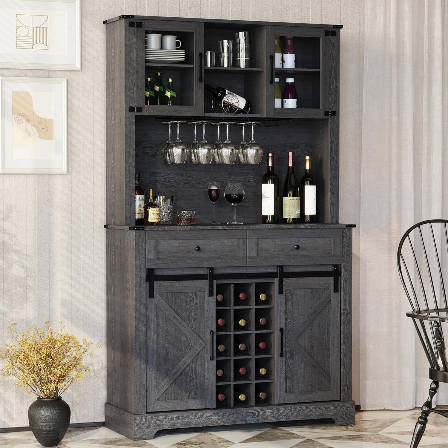 - Sliding Barn Doors- This home bar cabinet with hutch features a sliding barn door design with smooth and quiet metal tracks that flexibly divide different storage and display areas. Makes it easier to take items and Adds a touch of rustic charm to your home with this Wine Cabinet
