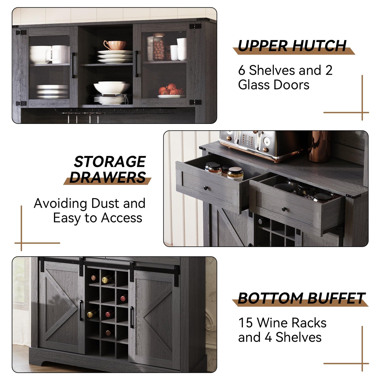 ARTPOWER Wine Bar Cabinet with Sliding Barn Door, 72" Hutch Cabinet with Wine&Glasses Rack, Tall Farmhouse Kitchen Pantry Buffet with Drawers for Dining Room, Gray