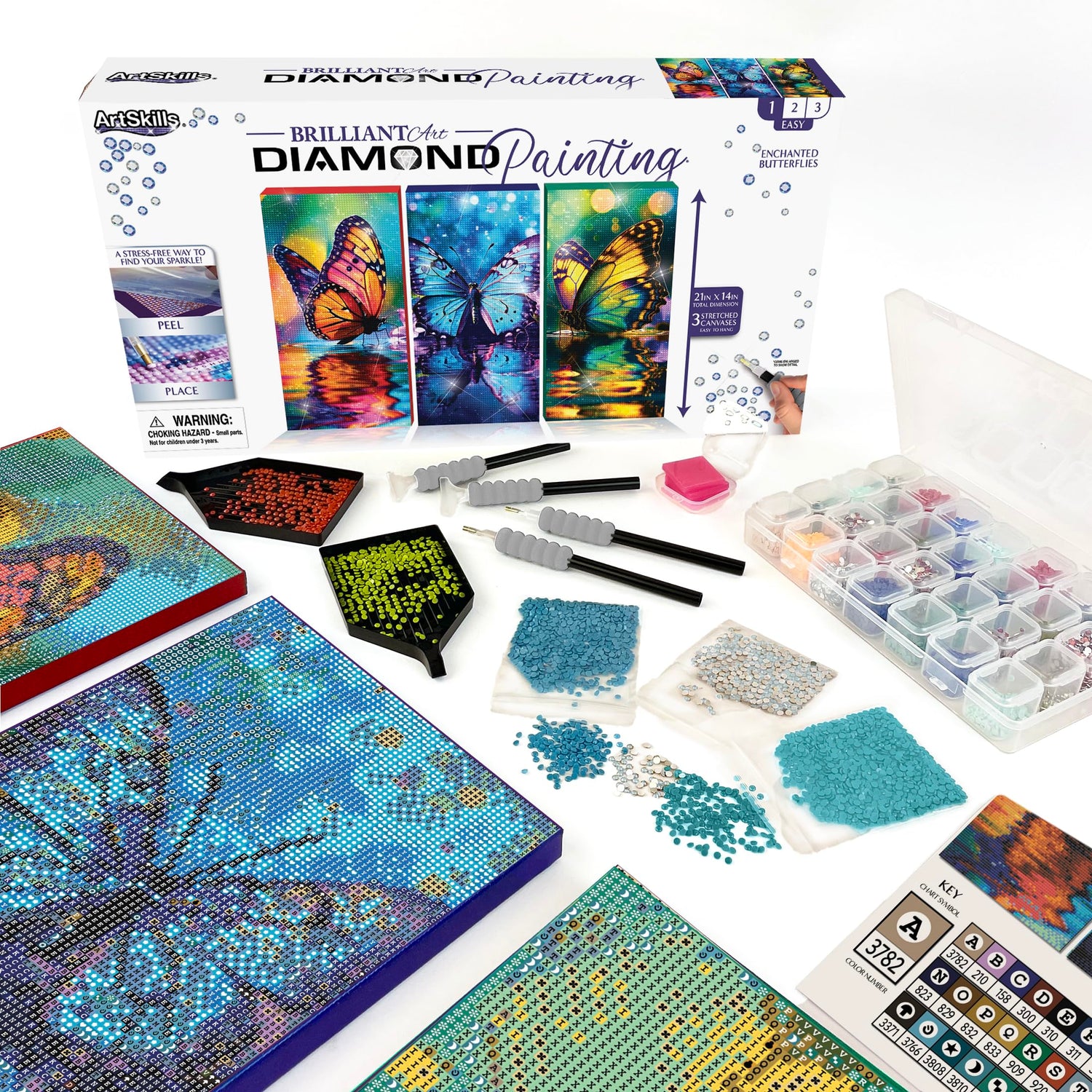 ArtSkills Diamond Painting Kit, Diamond Art Ready to Hang Framed Canvas with Storage and Accessory Kit, Enchanted Butterflies, 3 Stretched Canvas Panels, 14” x 7” Each