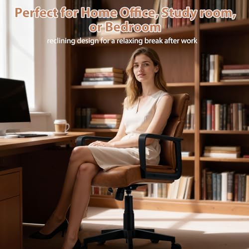 Artswish Leather Office Chair Brown Desk Chair with Wheels Arms, Mid Back Leather Executive Computer Chair Mid Century Chairs for Home Office