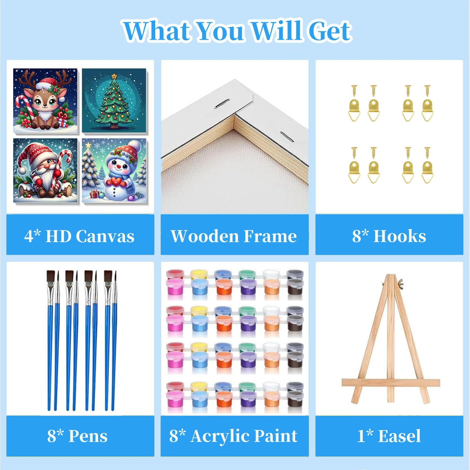 Arttoplus 4 Pack Paint by Numbers Kit for Kids with Frame,Cute Christmas Kids Paint by Numbers Ages 4-8-12 with Wooden Easel,Easy DIY Acrylic Oil Painting by Number for Gift Home Wall Decor(8x8 inch)