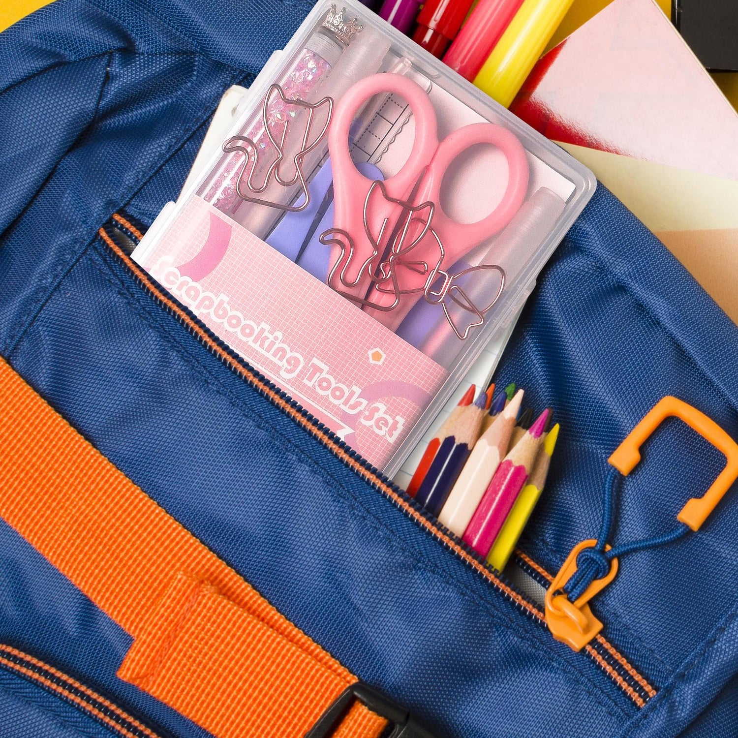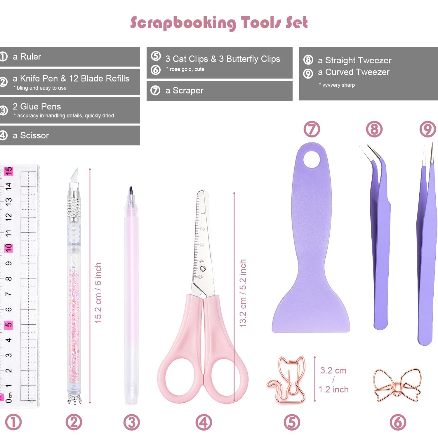 - 🦄 DESIGN - Arvakr scrapbook tools set is careful design to help your creations better, one solution does it all. Come with a PP case that's for easy to carry. Checklist: 2 Glue Pens, 2 Tweezers, a Scraper, a Knife with 12 Blades, a Ruler, a Scissor 6 Paper Clips and a PP Case.