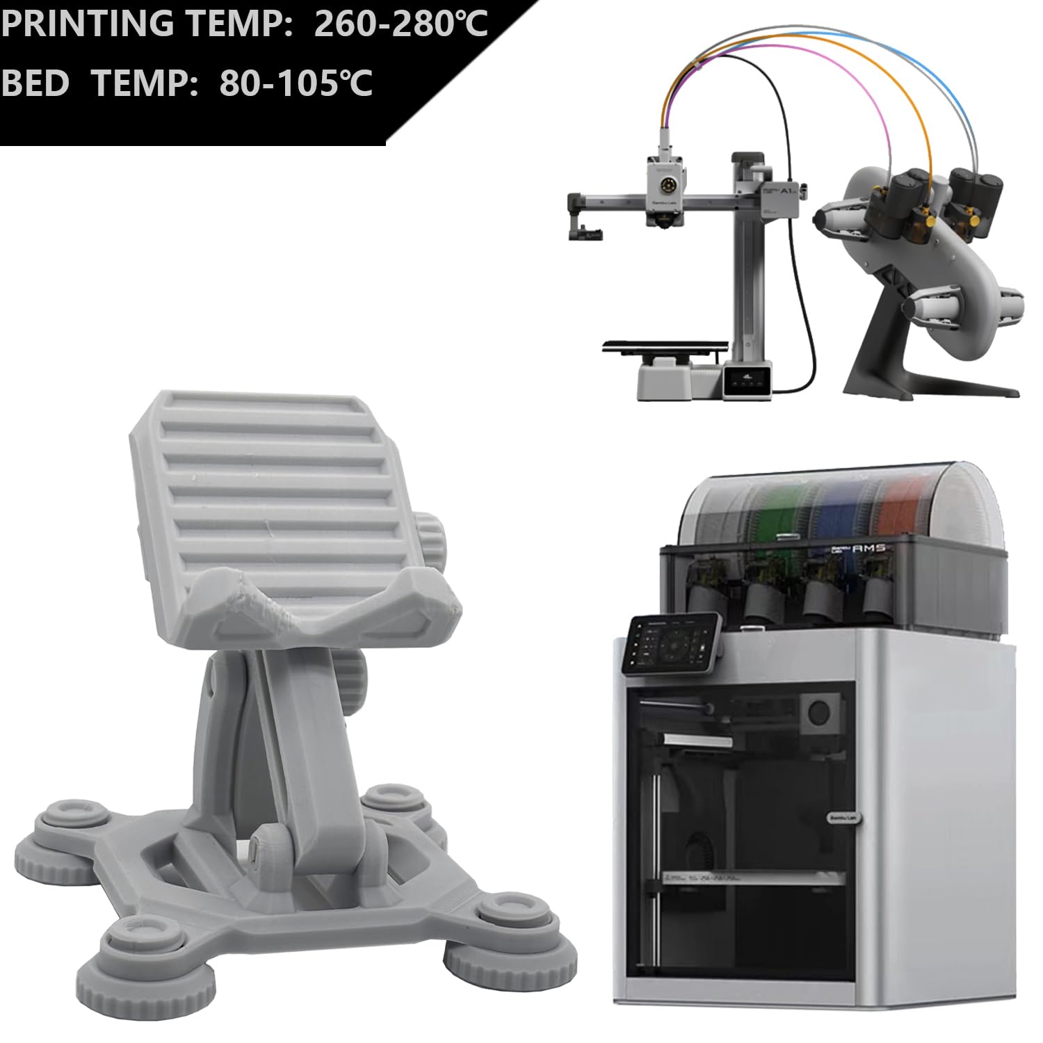 - 3.Printing Settings:Nozzle: 230-280℃ ; Bed: 95℃ - 105℃ ; Speed: 50mm/s (Settings can be adjusted depending on the 3D printer, you can refer to the 3d printer abs 1.75mm filament settings) To print large parts without warping issue, we recommend using an enclosed printer to maintain a warm environment around the print