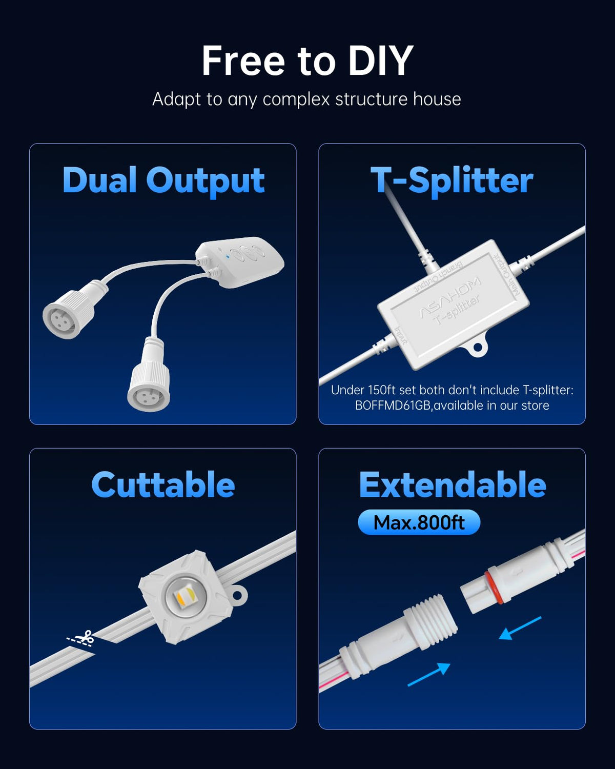 - 【Cuttable & Splicable】ASAHOM permanent outdoor lights with dual output provide included extension lights and extension cords in multiple size, no cutting required. Or you can cut the light string to get the desired length, then use included wire connector and waterproof junction box to splice the lights. Support extend to Max.800ft. (T-splitter: B0FFMD61GB)