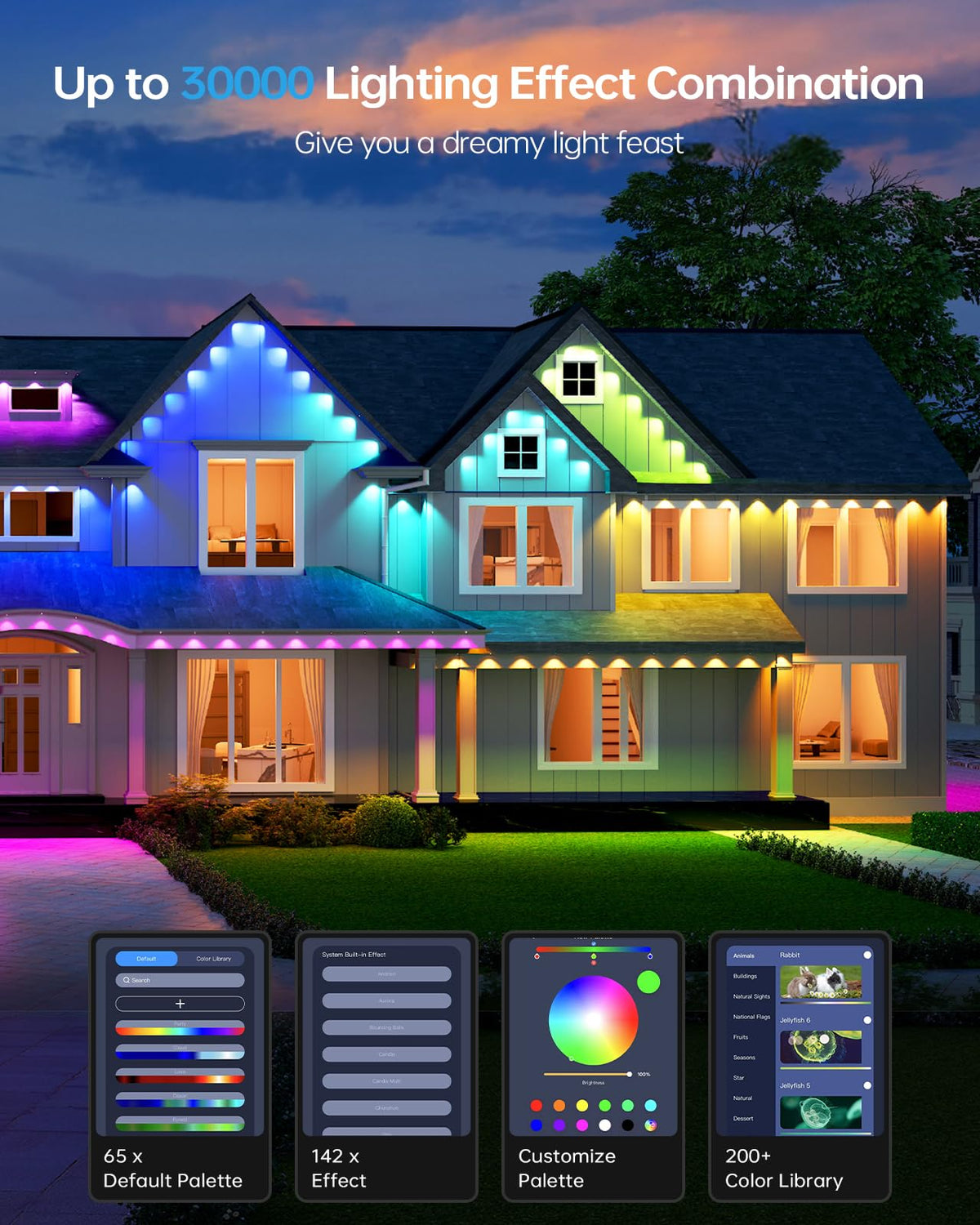 - 【Over 30,000 Lighting Effect Combinations】ASAHOM permanent outdoor lights combine 289pcs color palette with 142pcs effects to freely match more than 30,000 dynamic lighting effect combinations. Also support create favorite color palette to customize own lighting mood. And set different lighting effects and color for multiple zones.