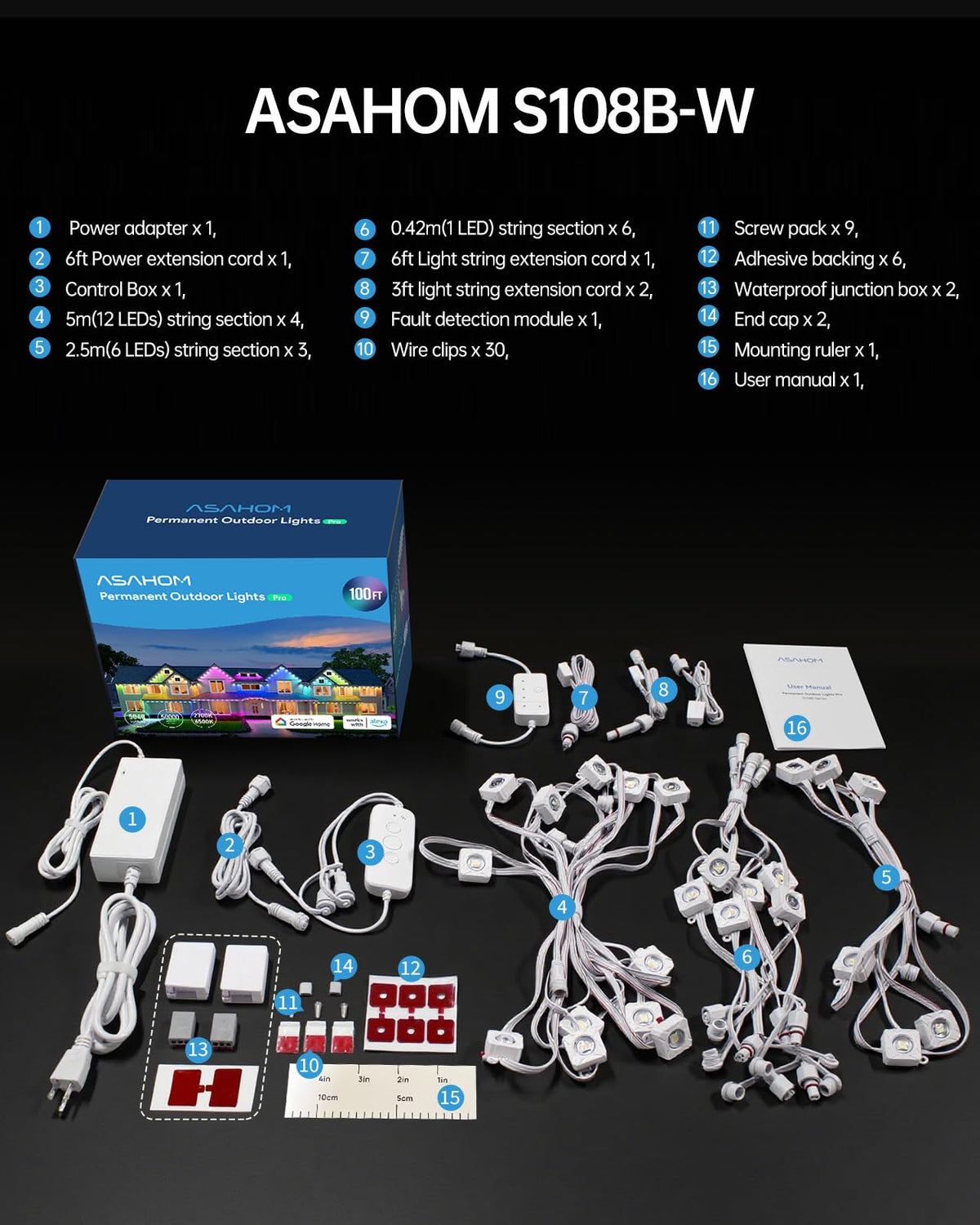 ASAHOM Permanent Outdoor Light Pro S108B, 100FT with 72 RGBCW 70lm LED, WLED Integration, AI Lighting, 30000 Lighting Effect Combination, IP67 Waterproof for Halloween Christmas and Daily Decor, White