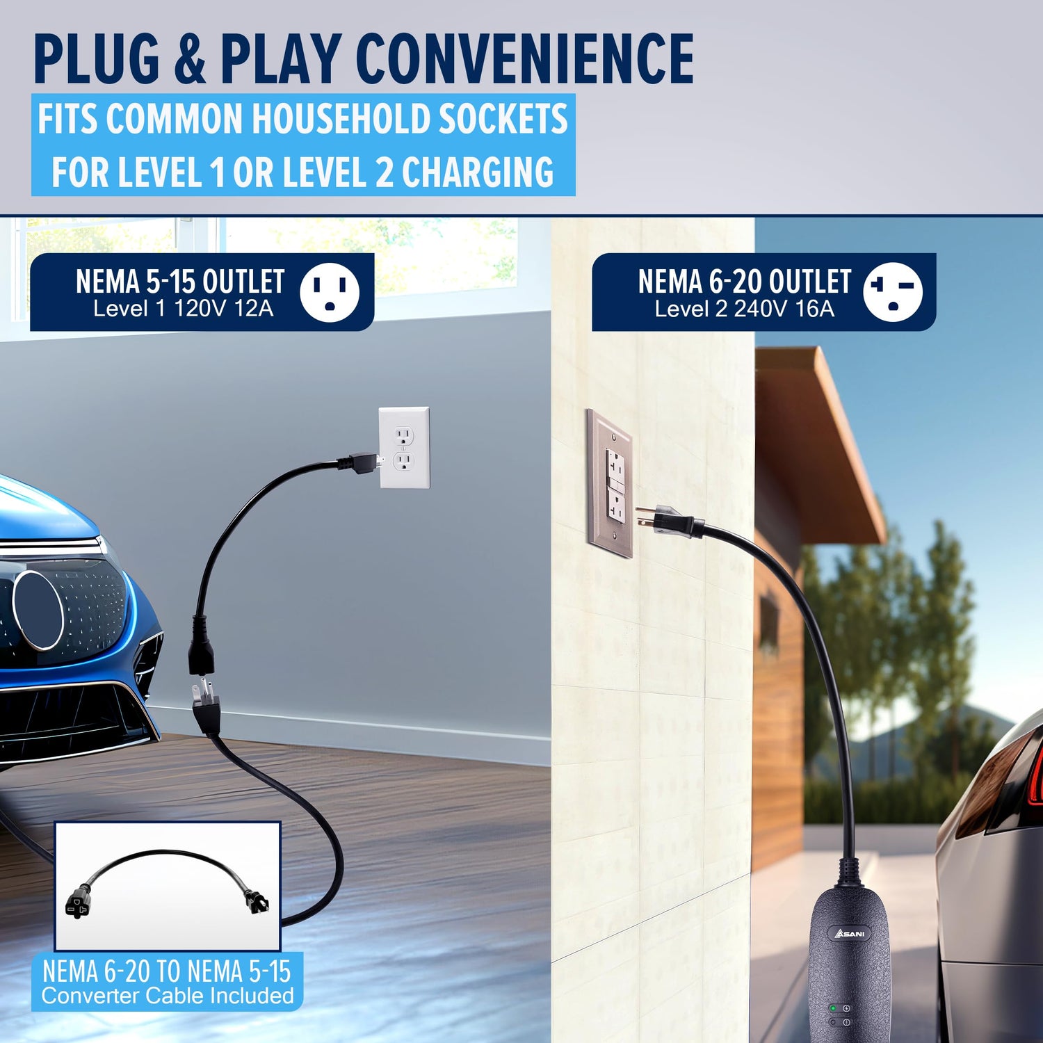 Asani Level 1 & 2 EV Charger - 110-240V at 16 Amps - Portable Electric Vehicle EV Charger with NEMA 6-20 with NEMA 5-15 Adapter Plug for J1772 Electric Cars