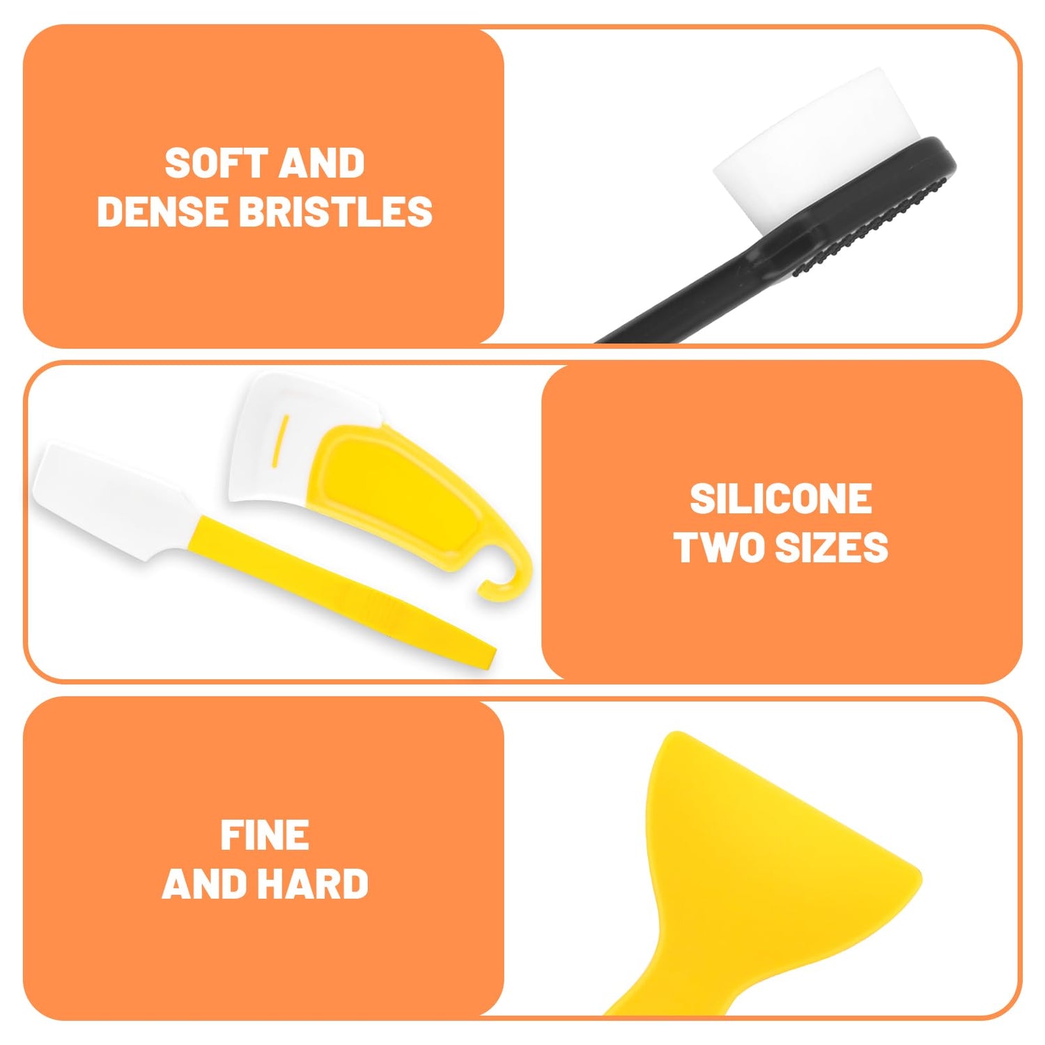 This kit includes two plastic scrapers and two short-handle silicone spatulas for thorough cleaning, as well as one long-handle silicone spatula for larger prints. Additionally, two soft-bristled toothbrushes are included for detailed cleaning of hard-to-reach areas.
