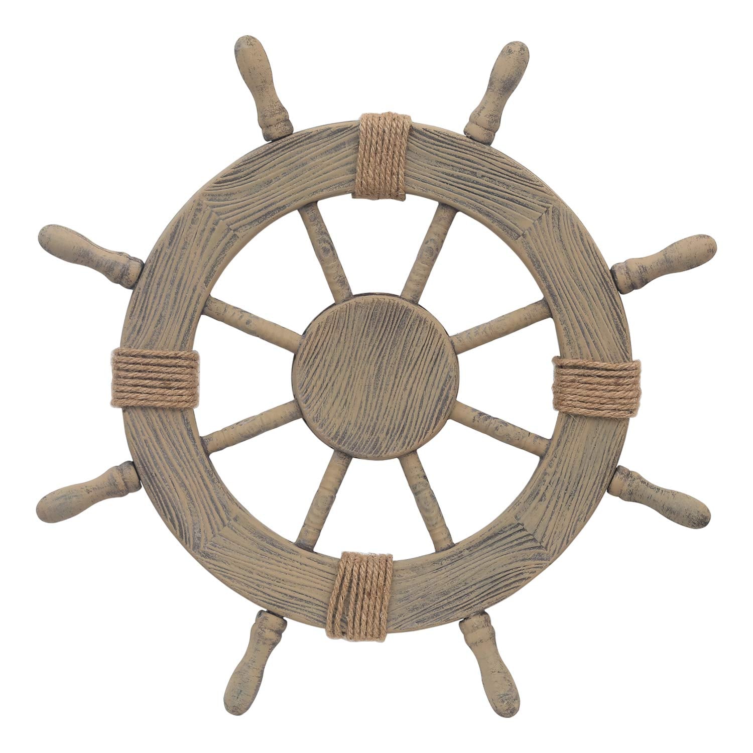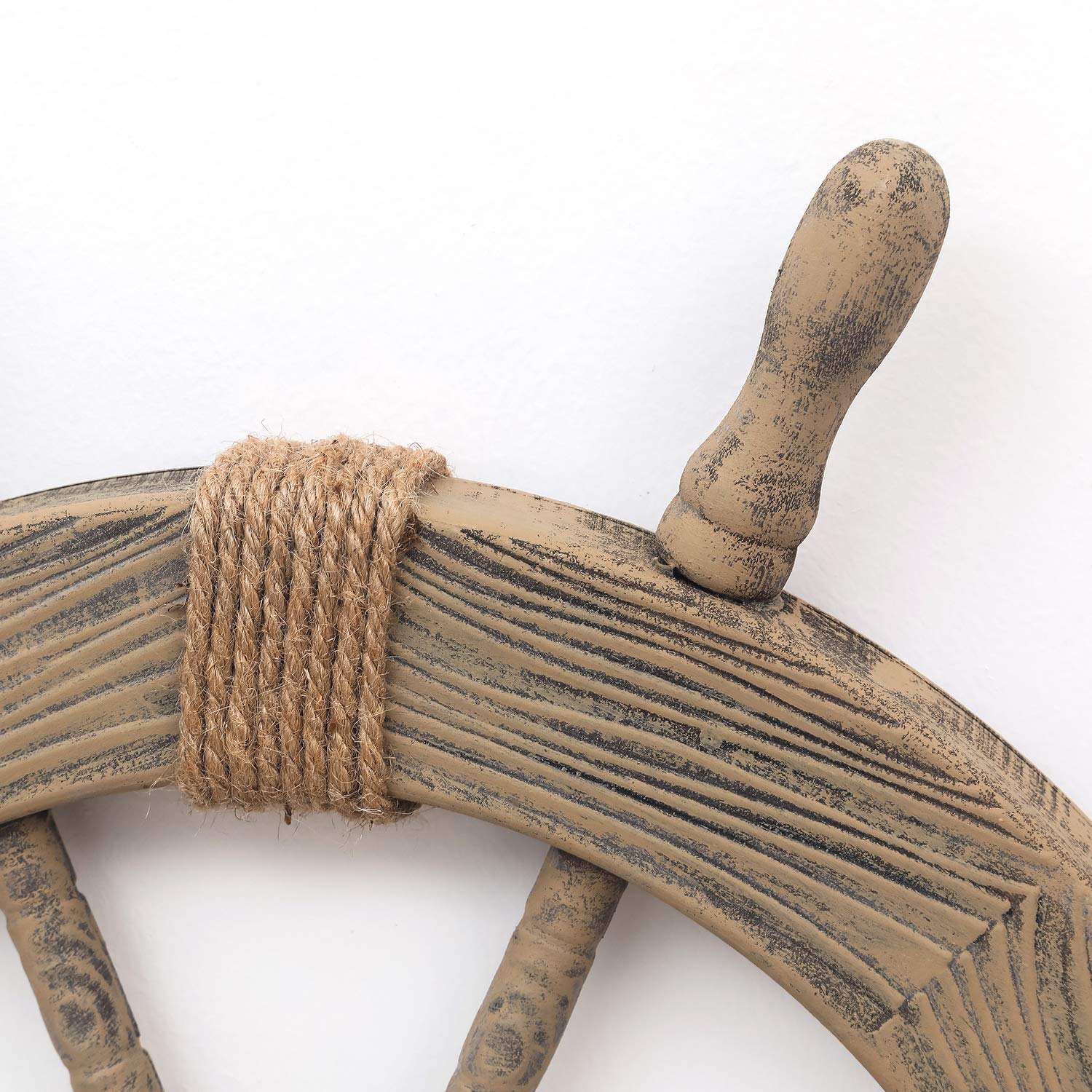 - Wood with rope details, metal hook, ship wheel, boat wheel, captains wheel. Antique-looking wood treatment wall hangings and wall art.