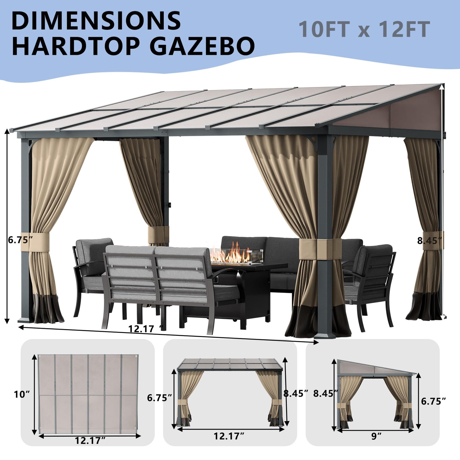 ASJMR 10x12FT Gazebo, Hardtop Wall Mounted Gazebo with Sloping Sun Panel Roof, Awnings for Patio with Metal Frame, Double Curtains for Garden, Lawn, Backyard Deck, Sand
