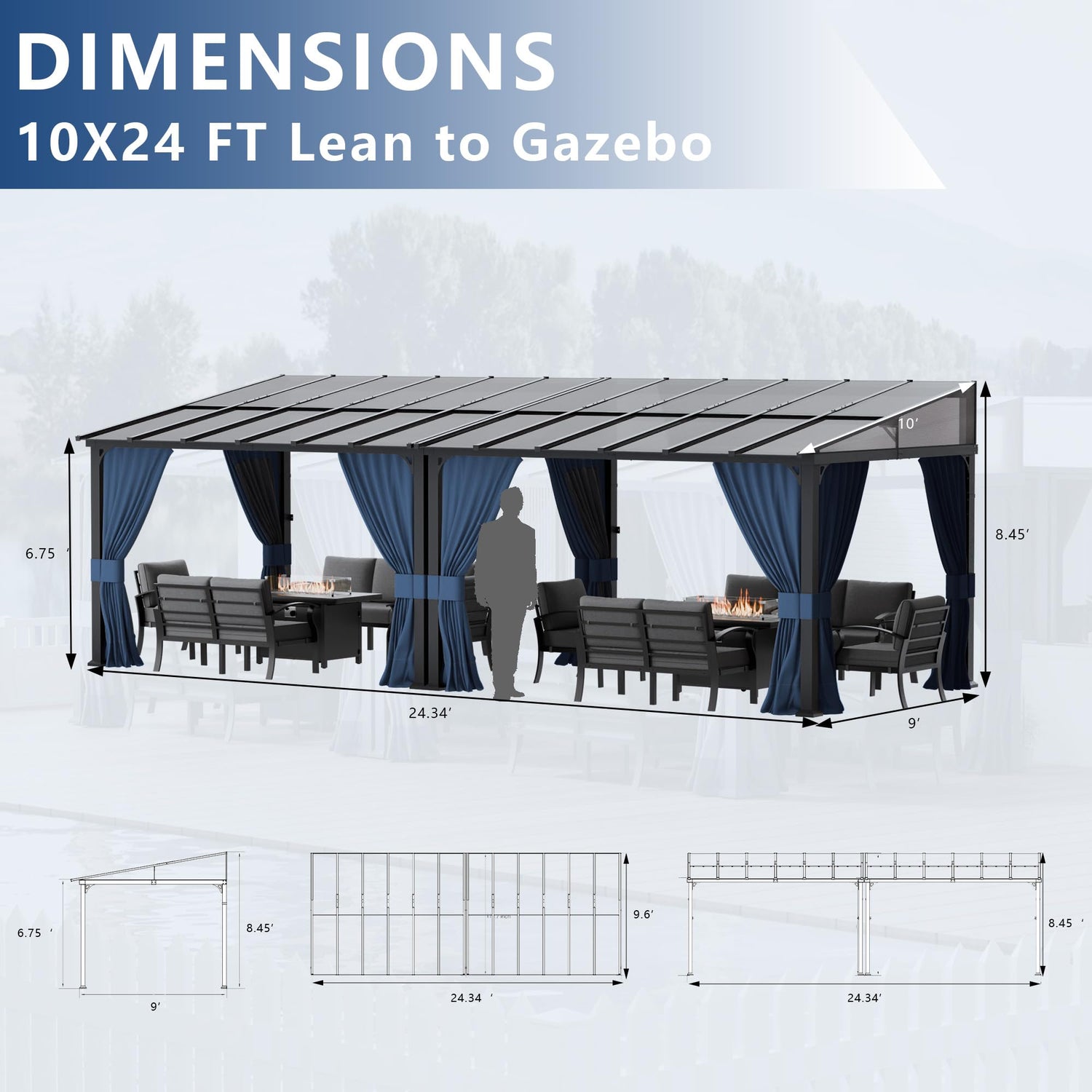 ASJMR Outdoor Lean to Gazebo 10x24FT, Hardtop Wall Mounted Gazebo with Sloping Sun Panel Roof, Awnings for Patio with Metal Frame, Double Curtains for Garden, Lawn, Backyard Deck