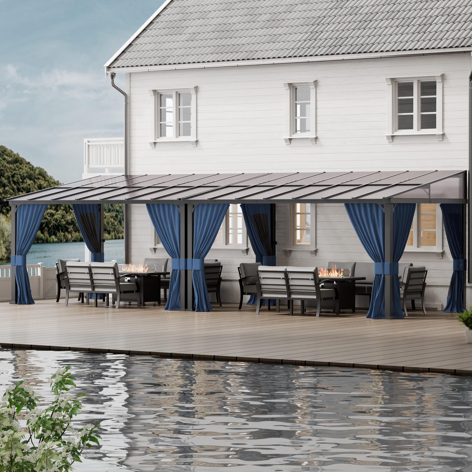 ASJMR Outdoor Lean to Gazebo 10x28FT, Hardtop Wall Mounted Gazebo with Sloping Sun Panel Roof, Awnings for Patio with Metal Frame, Double Curtains for Garden, Lawn, Backyard Deck