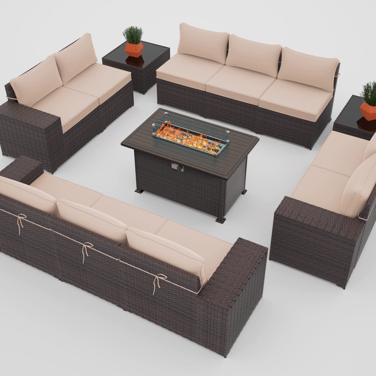 ASJMR Outdoor Patio Furniture Set with Gas Fire Pit Table, 13 Pieces Outdoor Furniture Set Patio Sectional Sofa w/43in Propane Fire Pit, PE Wicker Rattan Patio Conversation Sets (Sand)
