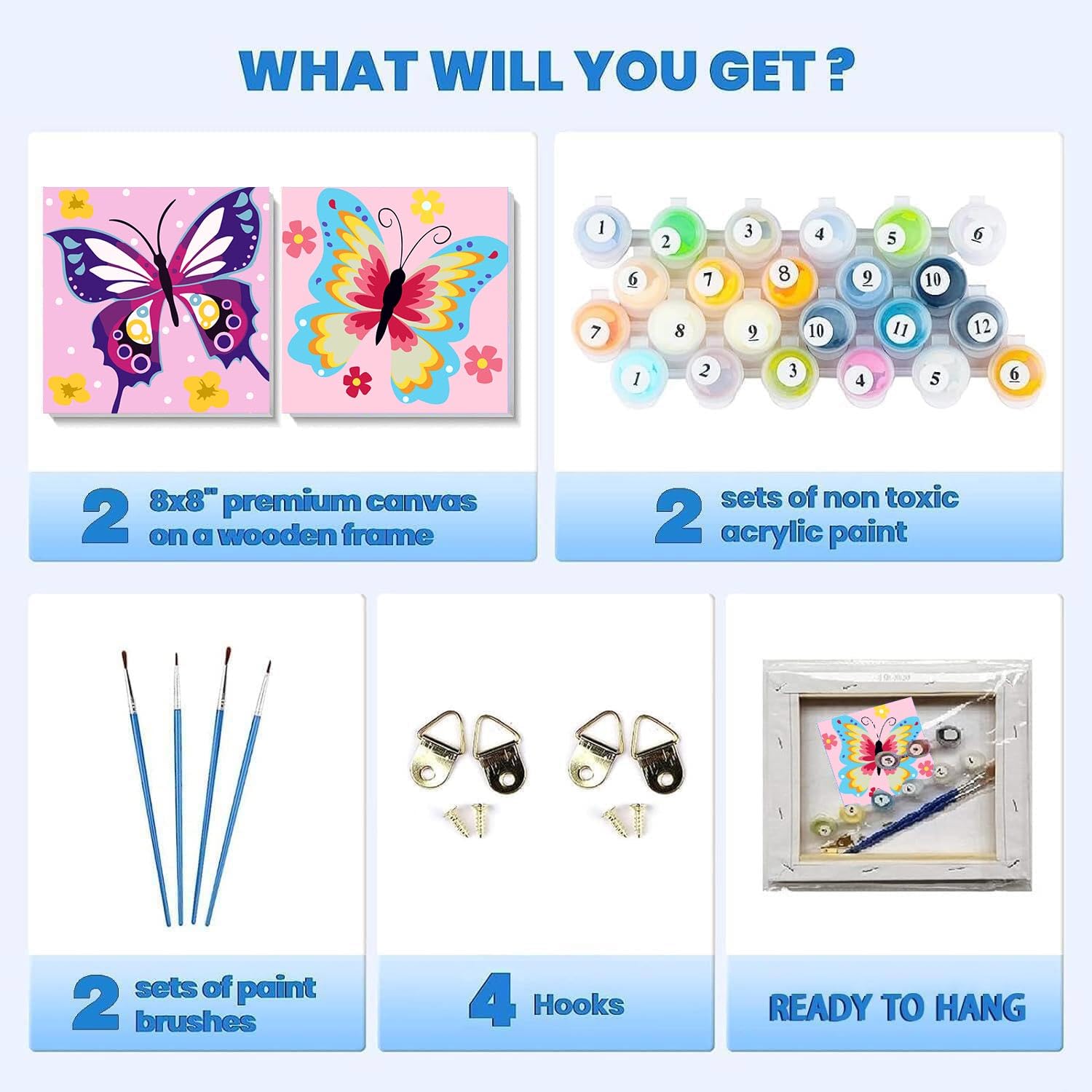 askkqtx 2 Pack Butterfly Paint by Number for Kids,Easy Paint by Numbers for Kids Ages 8-12,DIY Acrylic Oil Painting Kits for Home Wall Decor and Girls Gifts-8x8inch(with Wooden Framed)