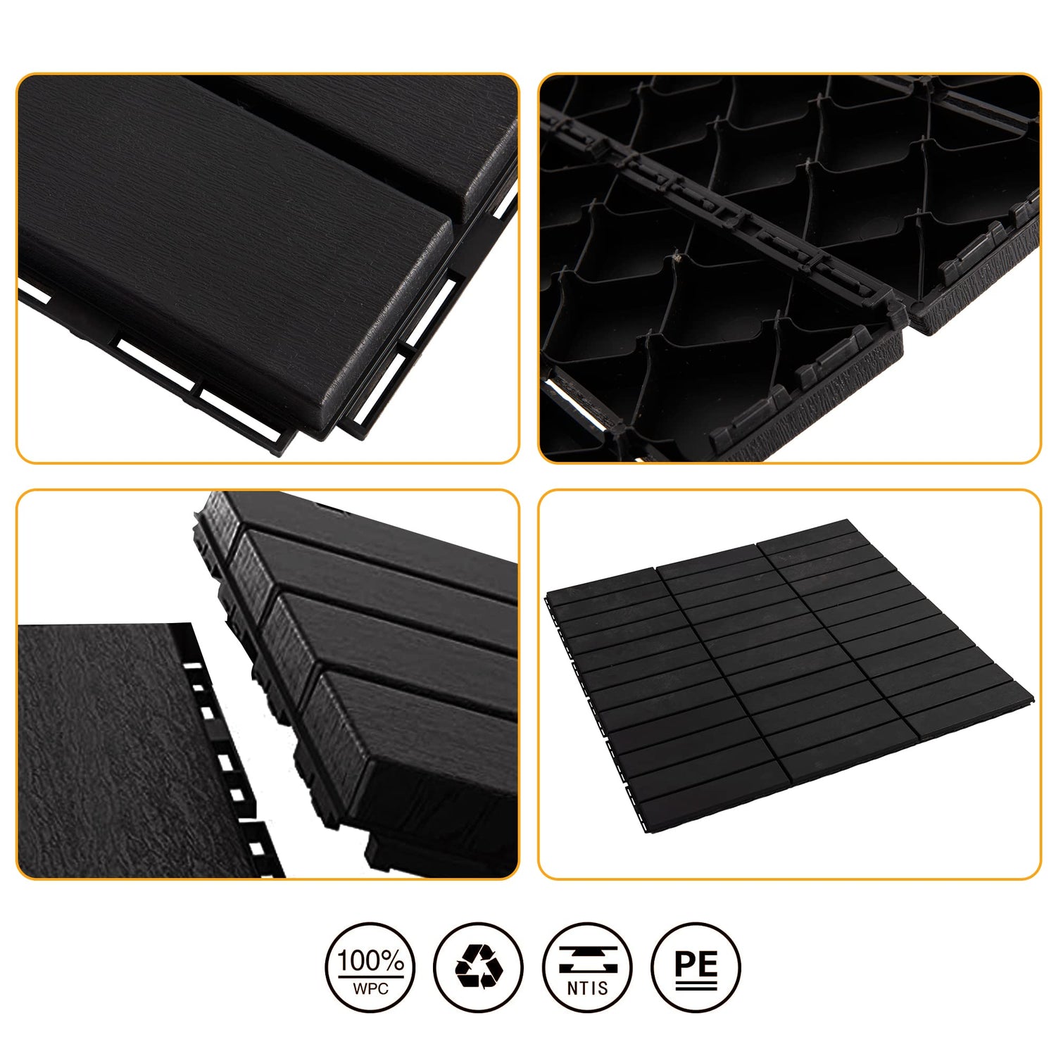 - Slip Resistant and Open Design - The grooves on the top surface of these outdoor patio tiles between each slat increase friction and help keep you from slipping when the tiles are wet. The underside of the outdoor tiles for patio have an open grid design that allows water to drain and for airflow to protect against damage.