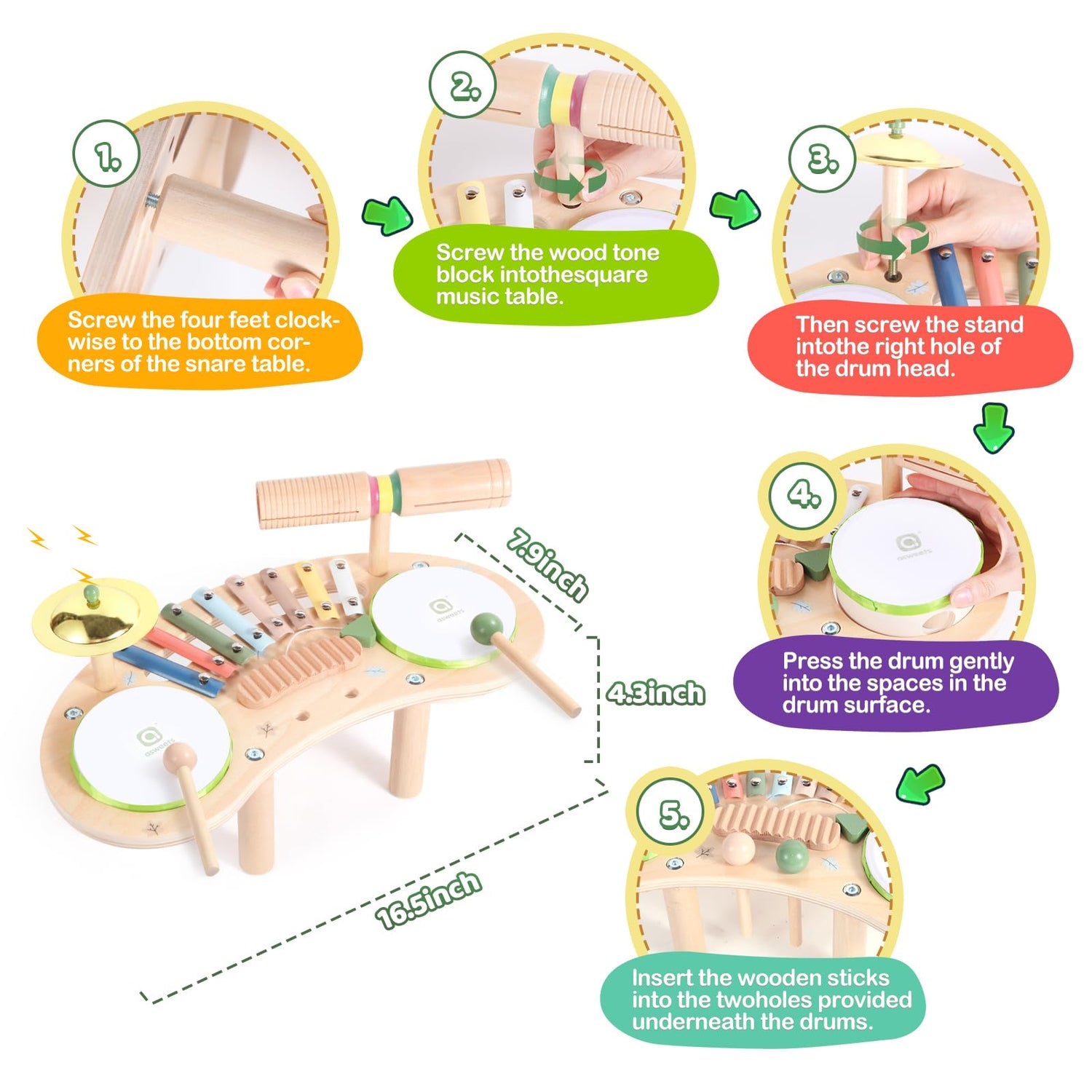 - 【7 in 1 Kids Drum】Toddler drum set not only enhances your child's interest in music and strengthens your baby's eye-hand coordination, but also develops fine motor skills and sense of hearing, which consists of a rounded music table, a xylophone, 2 wooden sticks, 2 drums, a Cymbal, a Cymbal stand, 4 Drum legs, and a scratch music consists of