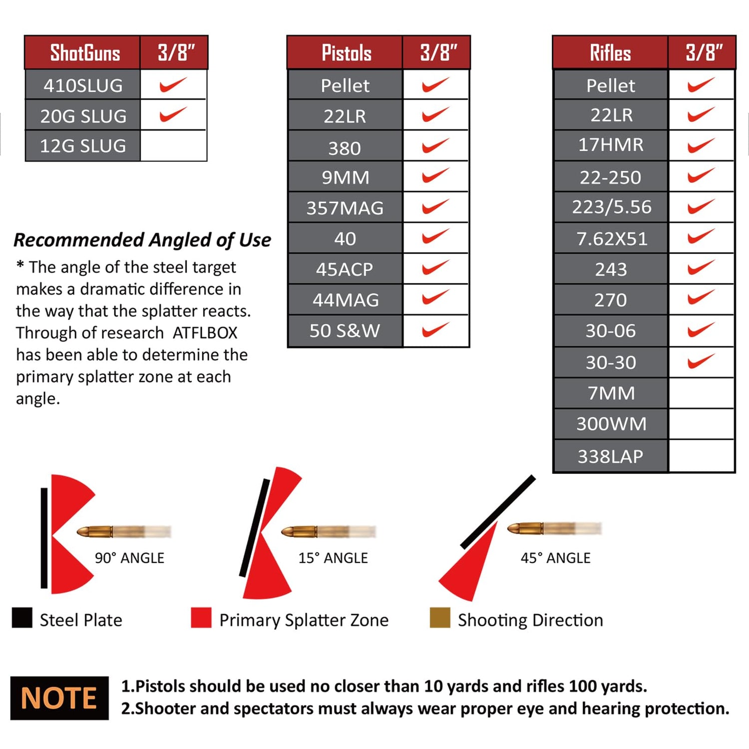 - AR500 STEEL TARGET: The laser-cut 3/8 inch thick steel target is designed for outdoor shooting and range shooting. The steel plate is powder-coated for durability. The brightly colored steel plate allows you to see clearly at the shooting range.