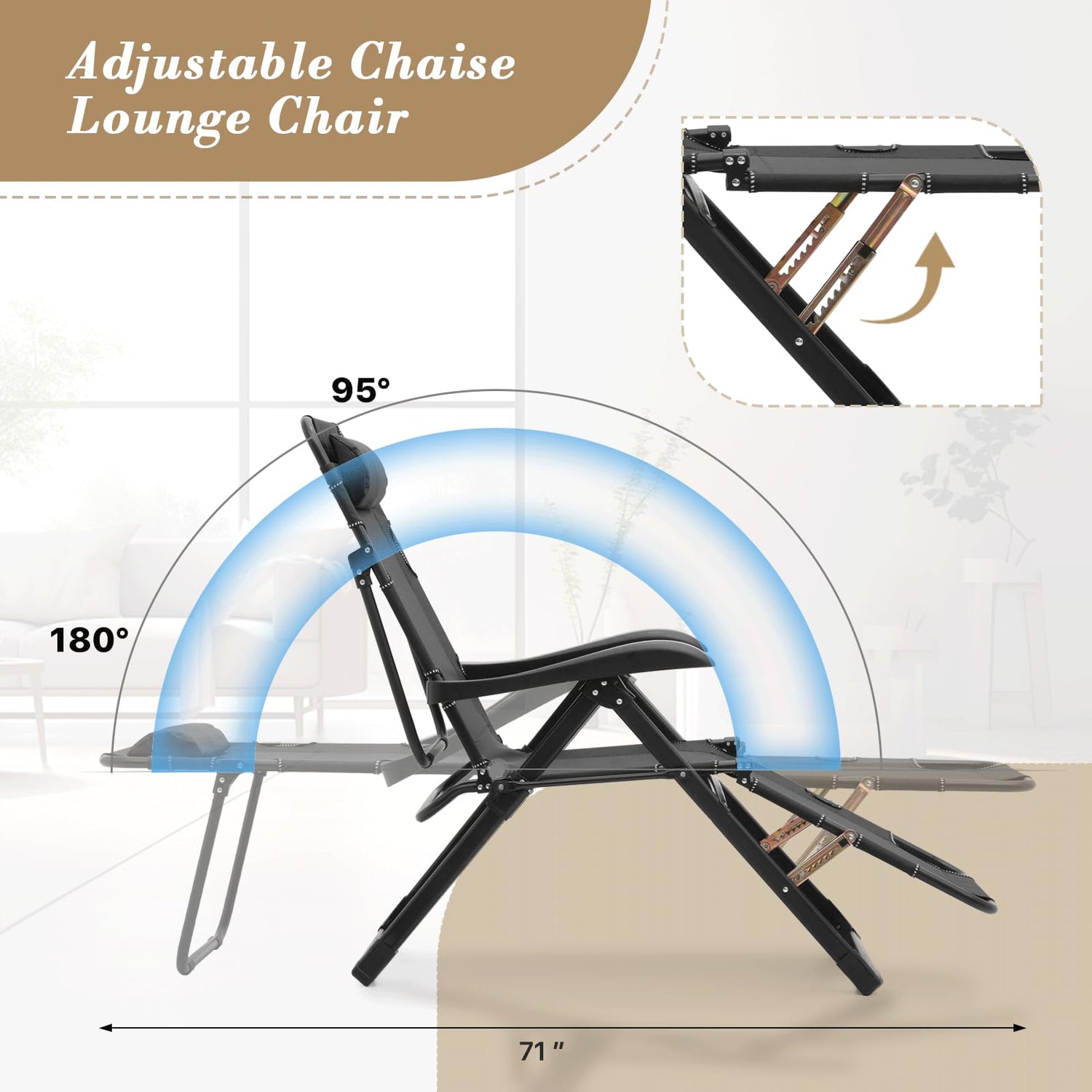 - Comfort: The folding chaise lounge chair offers adjustable recline angles and a cushioned headrest for ultimate relaxation. Its ergonomic design improves circulation and reduces spinal pressure.