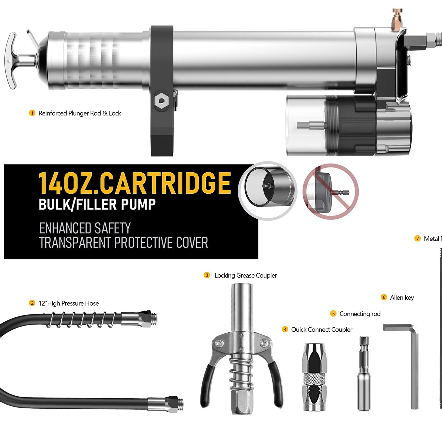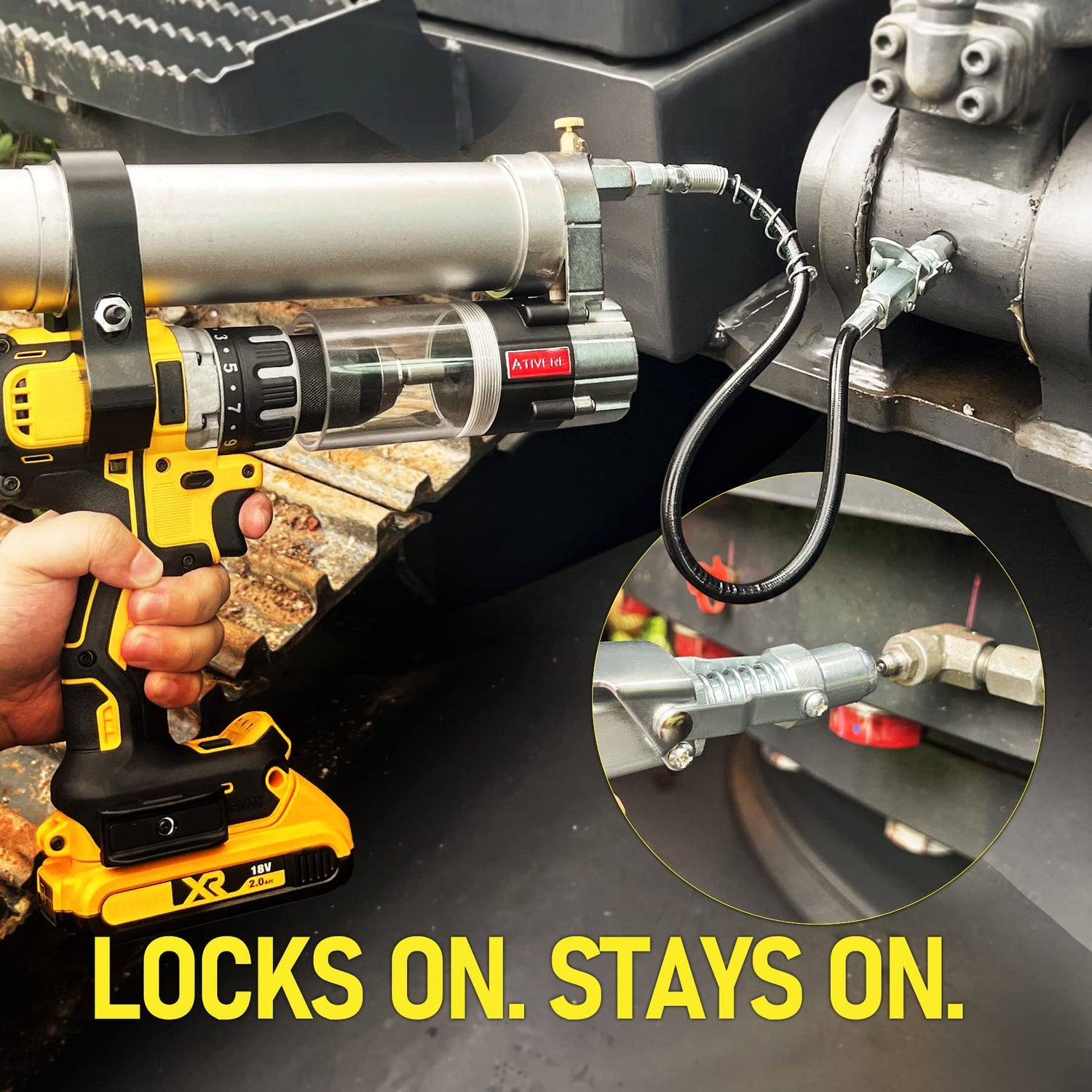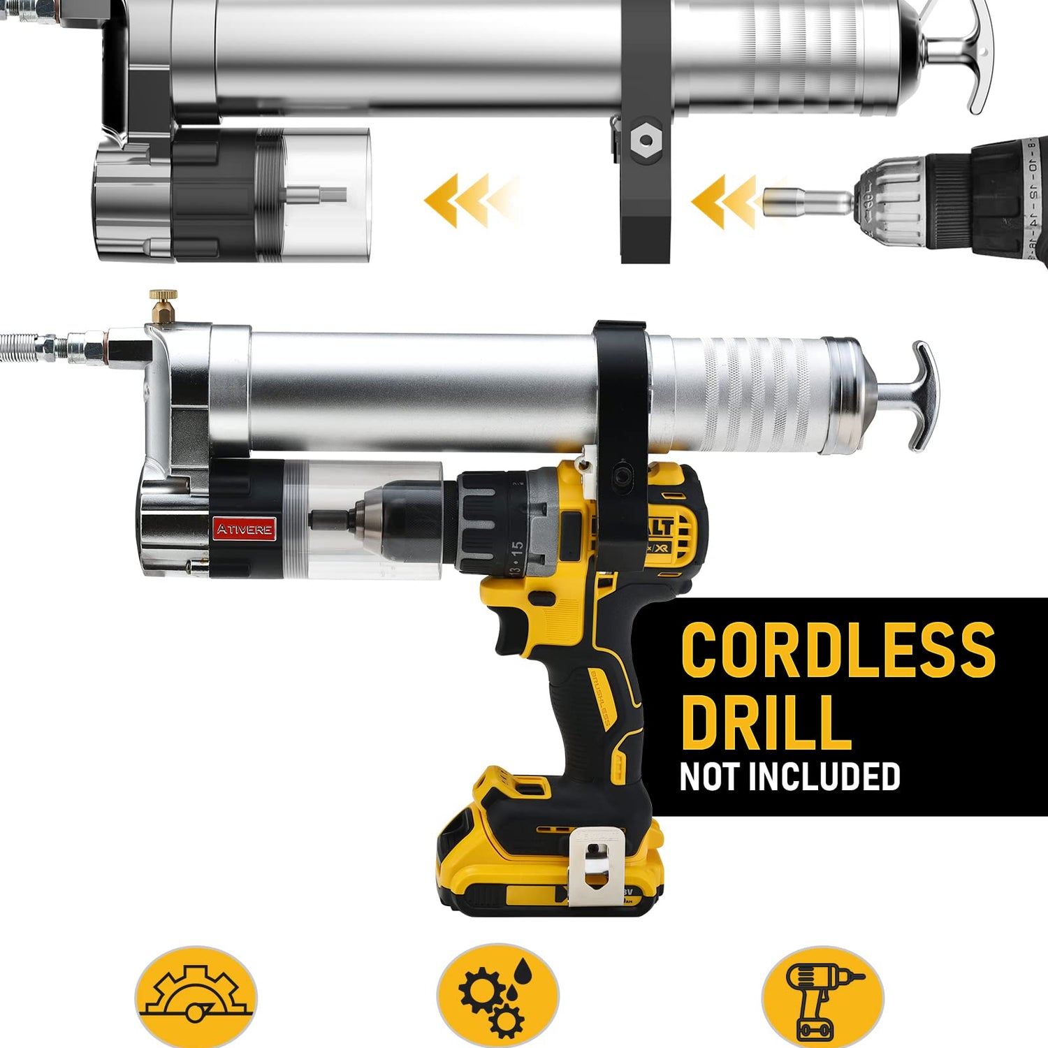 ATIVERE Electric Grease Gun Drill Adapter with 14 OZ Load, Locking Grease Gun Coupler, 12 Inch High Pressure Hose, Extension Rigid Pipe, Pneumatic Tool, Universal Conversion Gun Head