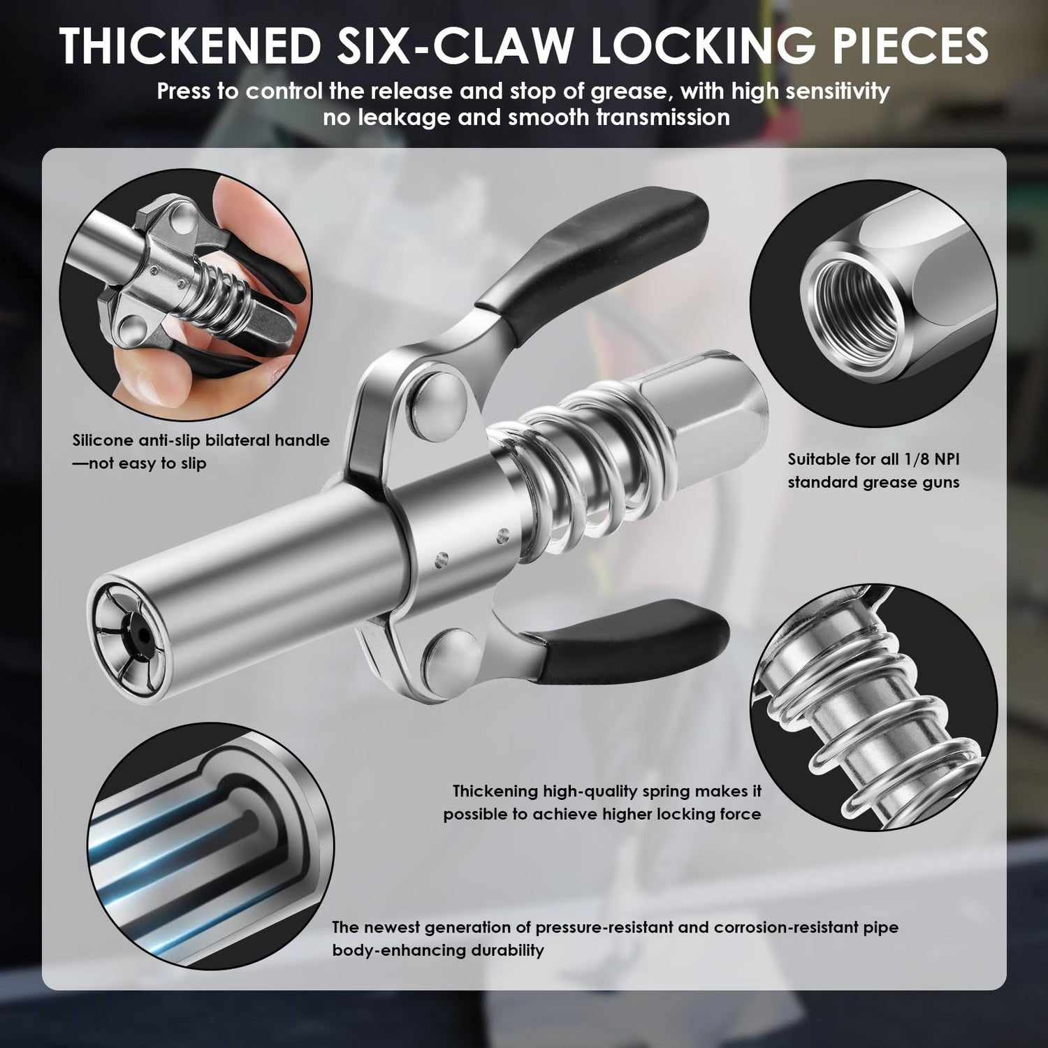 - 【PROFESSIONAL COUPLER & HIGH VERSATILITY 】2nd Gen pneumatic grease gun coupler upgraded to industry-leading 12,000 PSI, compatible with all grease guns 1/8" NPT grease gun fittings. No need to carry specific tools, your pneumatic tool, electric drills, or impact drivers can become your greese gun with grease. The smooth retraction mechanism allows one-hand operation.