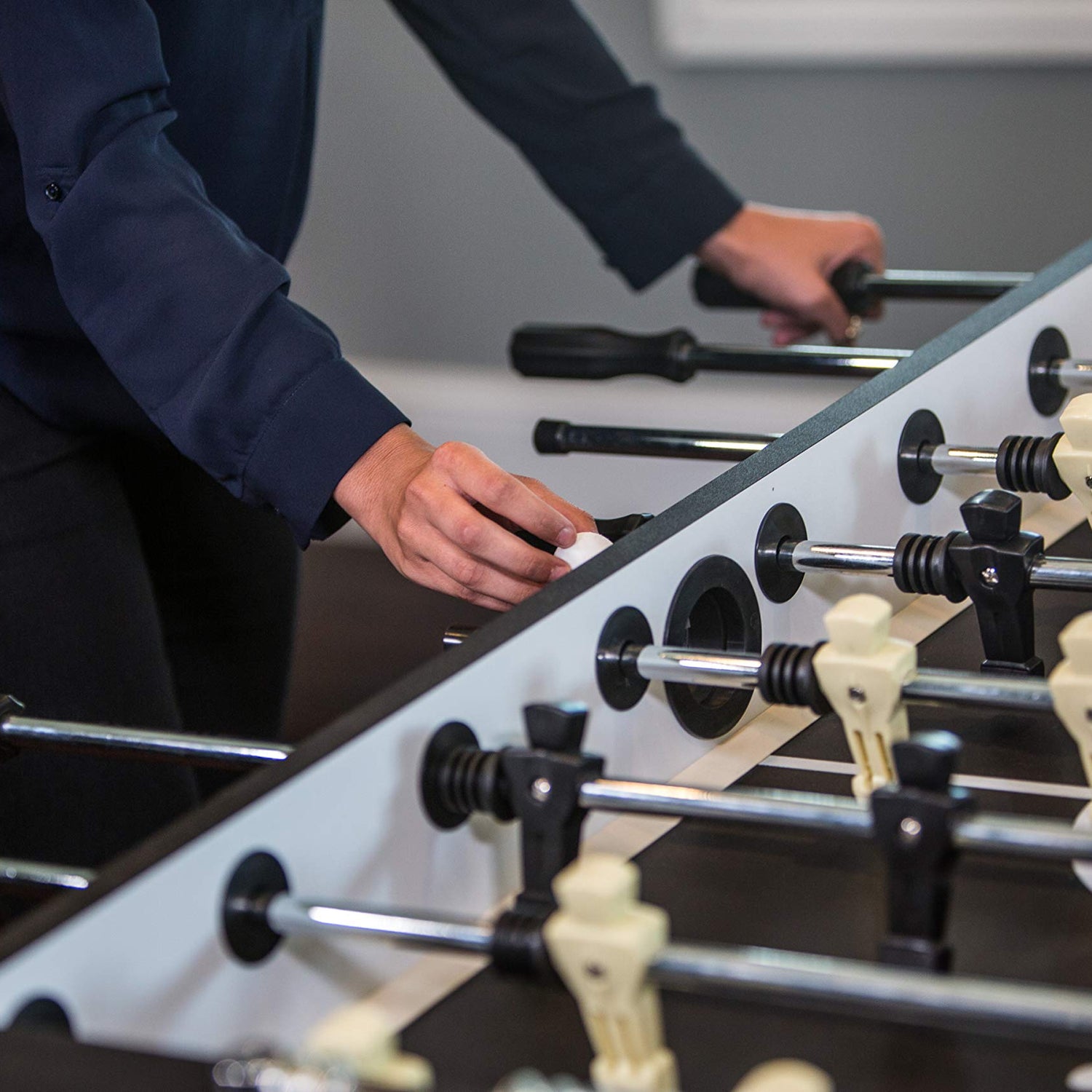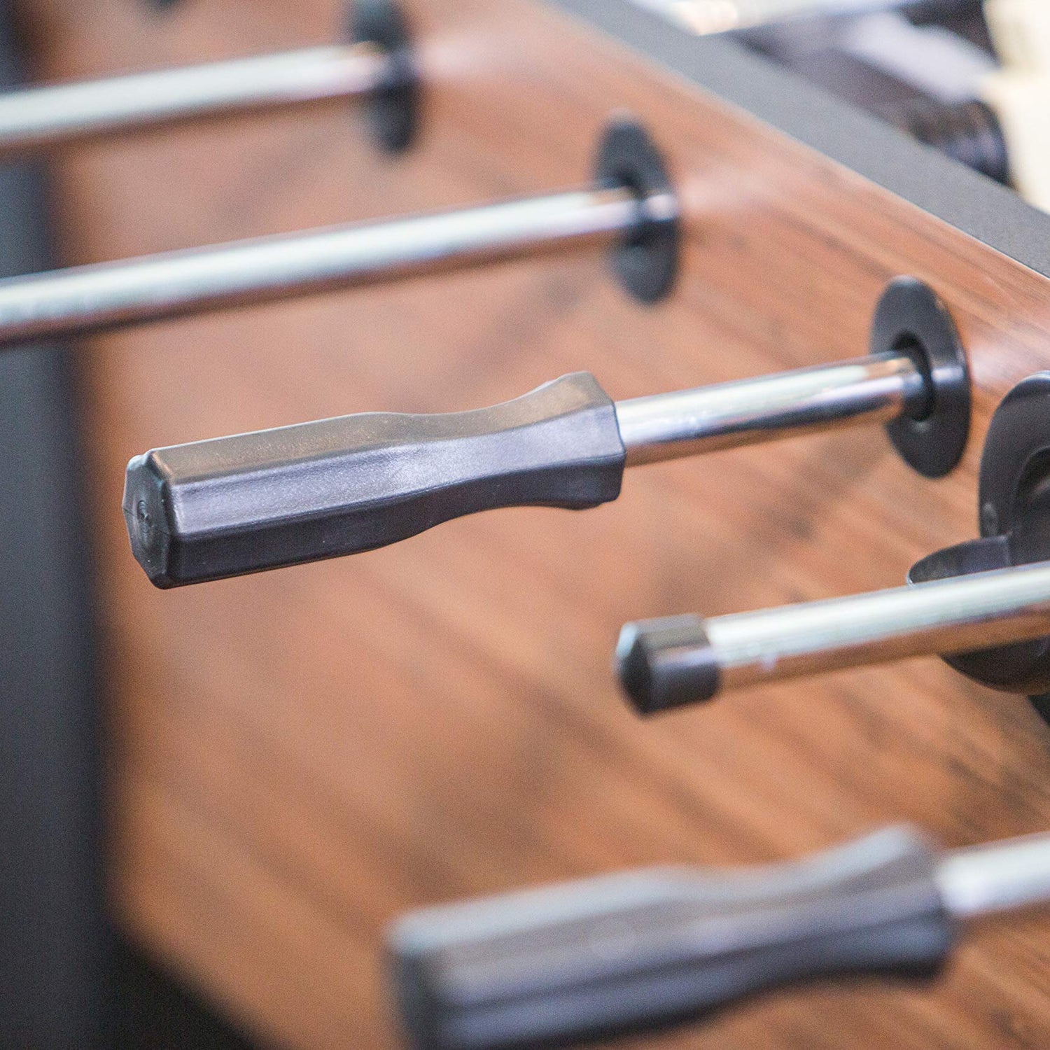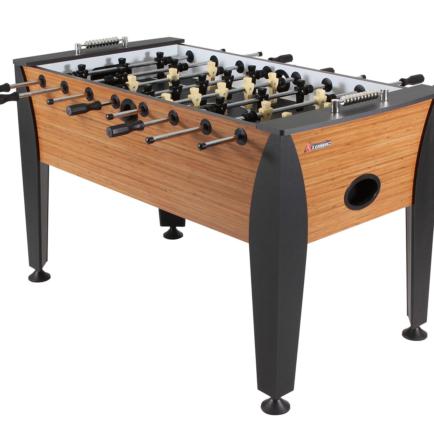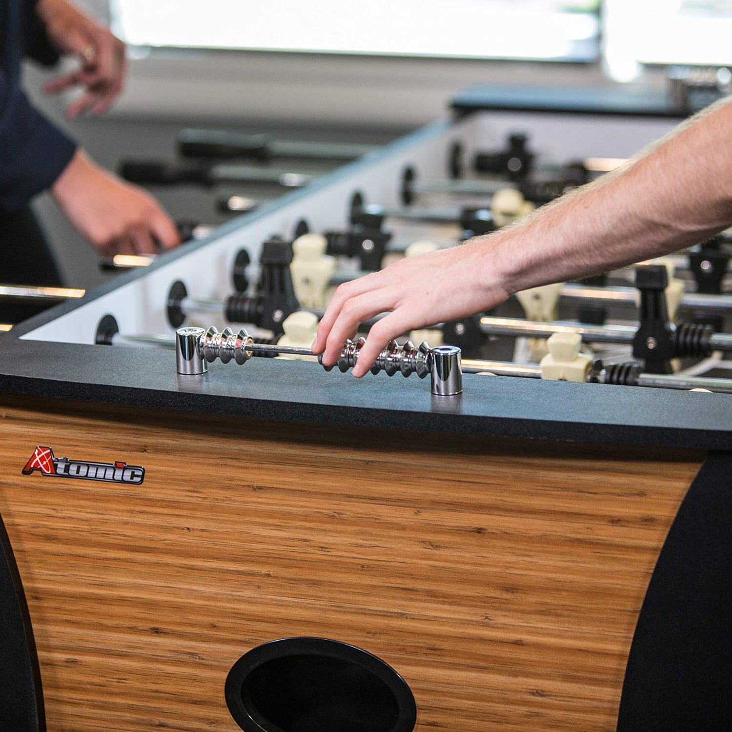 Details: A foosball table doesn't have to mean bright colors and flashing lights. The Atomic Pro Force 56 in. Foosball Table keeps it simple for a stylish looking game that would fit right into the professional office environment or the game room of your home. This durable MDF table features rich bamboo laminate, a manual scoring system, built-in ball return, and hollow chrome steel rods with comfortable rubber handles. This table doesn't simply look great, it plays great. The Pro Force measures 56" L x 29.5" W x 34.5" H and comes with four balls. This modern foosball table comes with robot-style players and hollow chrome steel rods and rubber octagonal handles. The table features engineered wood with stylish bamboo laminate and manual slide scoring system.