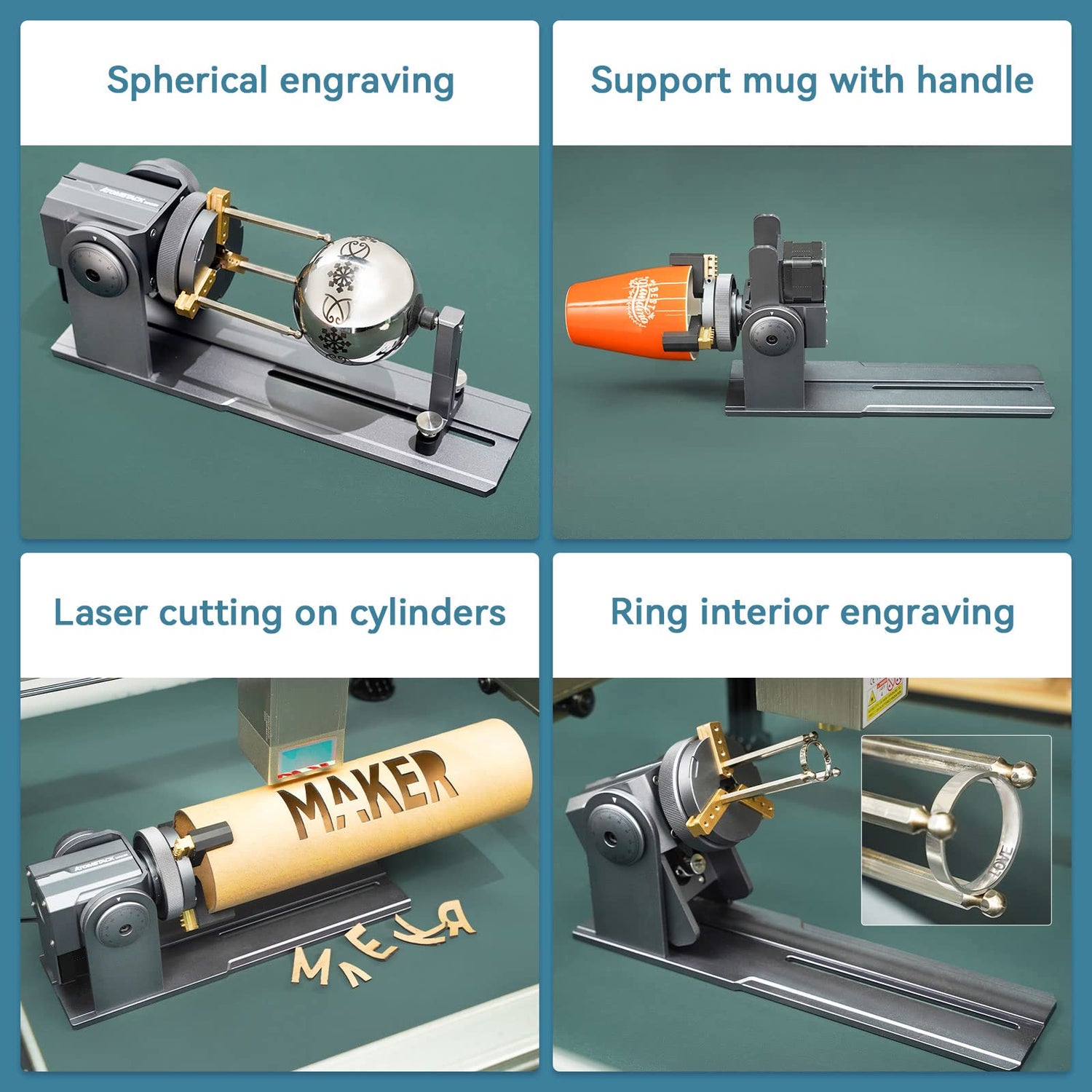 - 【Ideal for Engraving Irregular Cylinders】ATOMSTACK MAKER R1 PRO Rotary Roller is designed for engraving a variety of irregular cylindrical objects and offers an adjustment angle of up to 180° and a rotation capability of 360°. These include balls, rings, spherical objects, cups with handles and various irregular objects. The high quality rotary chuck ensures smooth and stable rotation, resulting in improved engraving accuracy.(Laser Class 4, Output power 12000mW).