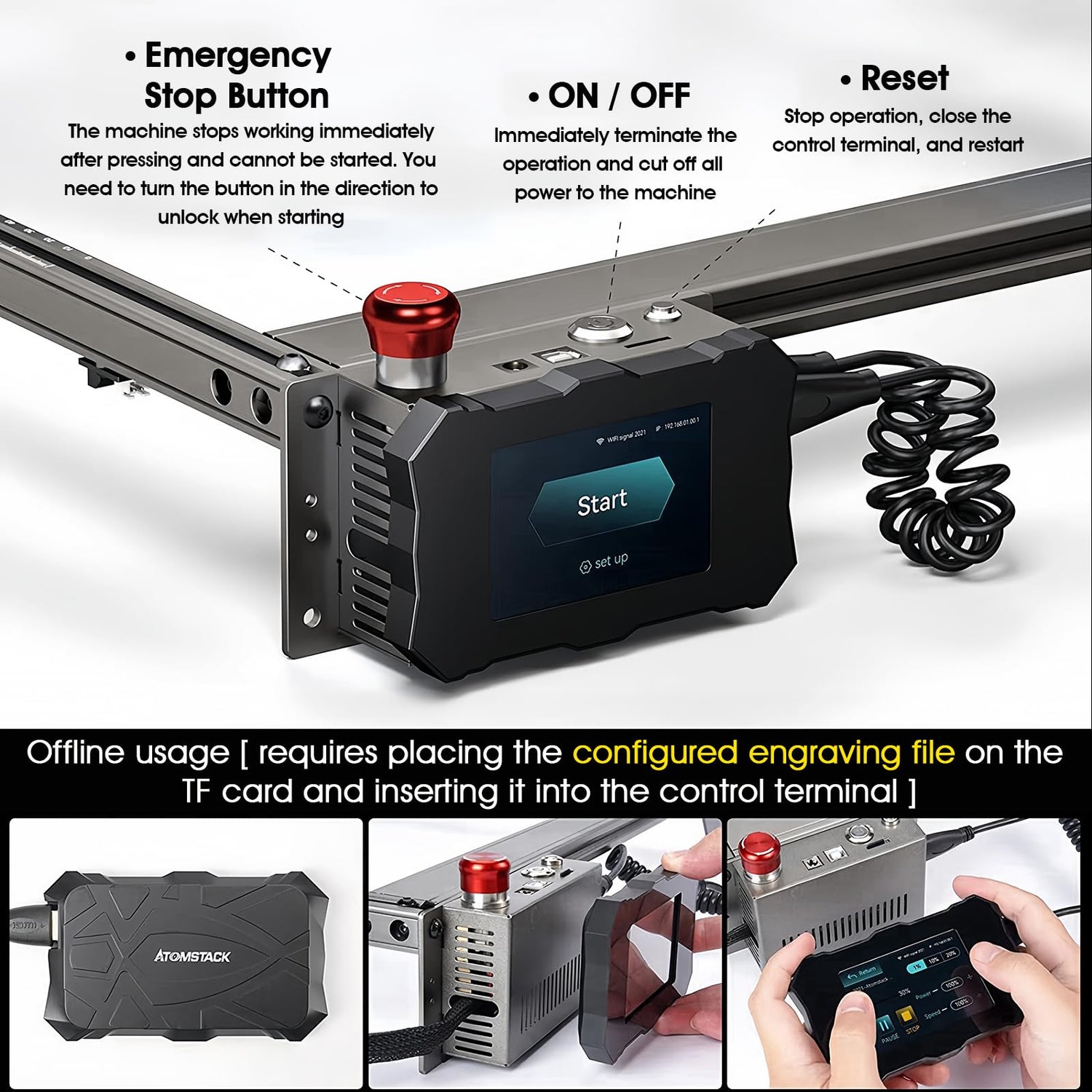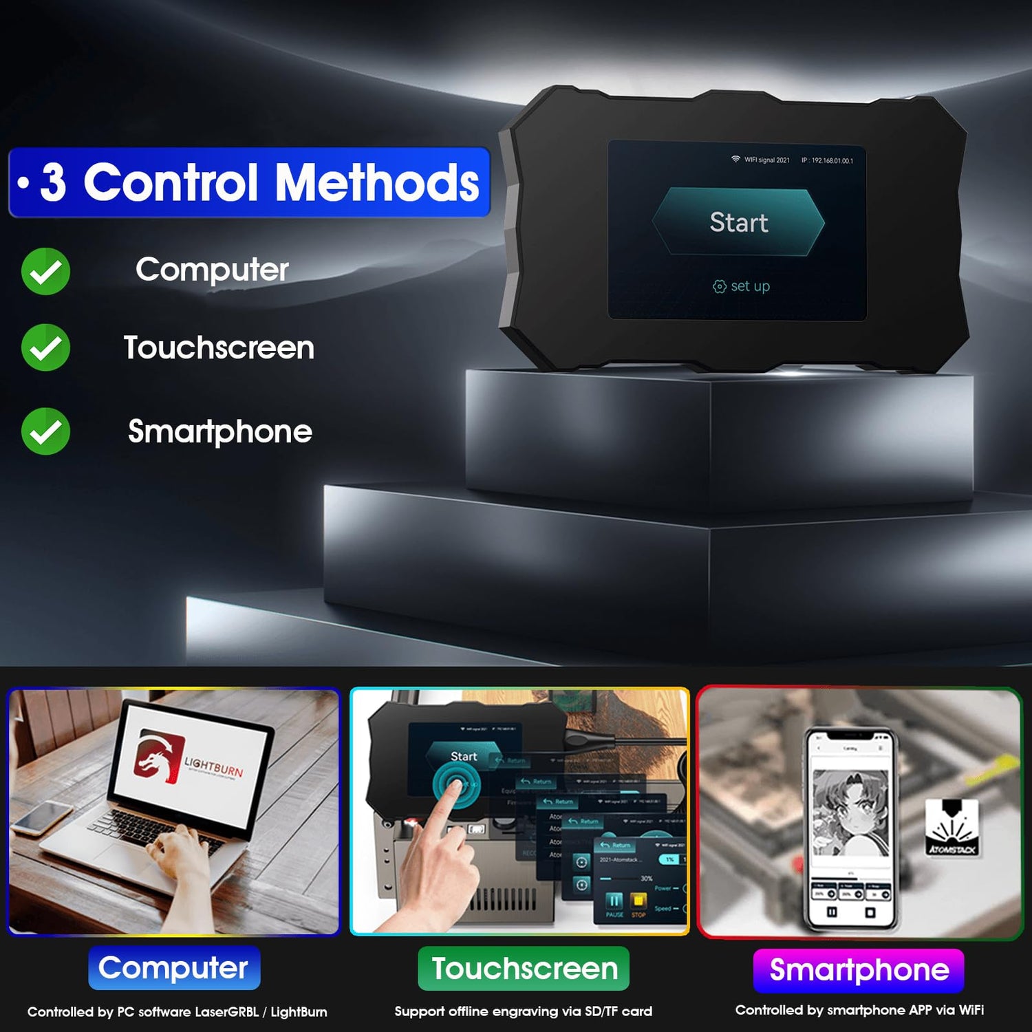 - ▶【Multiple Control Methods Available】The S10 Pro laser engraving machine can be controlled by computer software and smartphone APP. On one hand, in addition to LightBurn and LaserGRBL PC software, we have also developed an exclusive free "AtomStack Studio" PC software, simplifying the operation process and making it more beginner-friendly. On the other hand, "ATOMSTACK" self-developed free mobile APP is now available on Android and Apple App Store, which realizes mobile phone WiFi control.