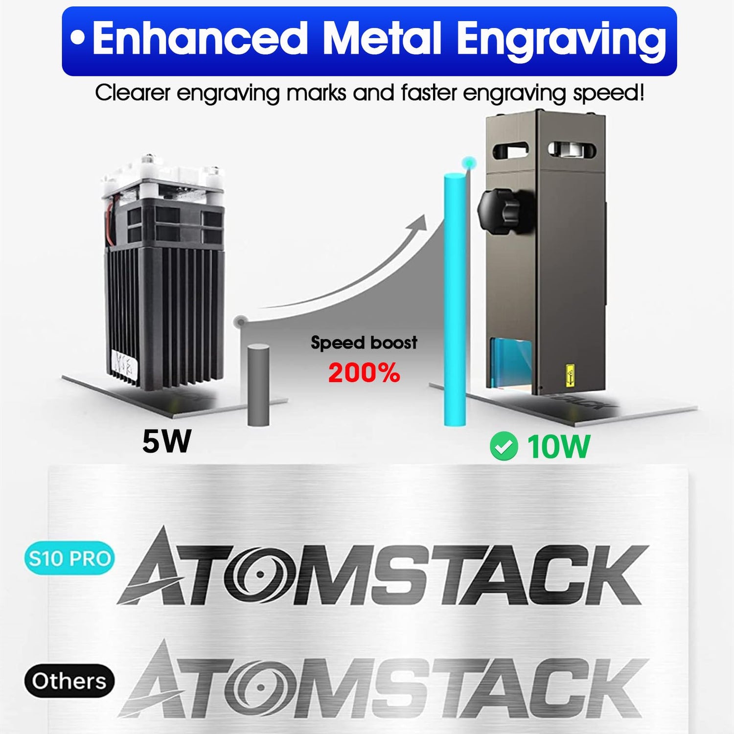 - ▶【Integrated Laser Engraving & Cutting】ATOMSTACK S10 Pro laser engraver adopts compressed spot with 10000mW output laser power (Laser Class 4). The ultra-fine laser focus area is reduced to 0.06*0.06mm, making it has high-precision engraving and High-penetration cutting. It can easily cut 20mm wood board and 15mm acrylic. Also it can directly engrave on wood, leather, stainless steel, coated metal, ceramics, glass and so on, where its engraving speed is 40% higher than the ordinary model.