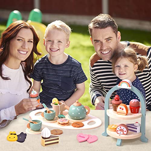 Atoylink Wooden Tea Party Set for Little Girls 28 Pcs Toddler Tea Set with Cupcake Stand & Food Pretend Play Accessories Kids Kitchen Playset Wooden Toys for 2 3 4 5 6 Year Old Girl Birthday Gift