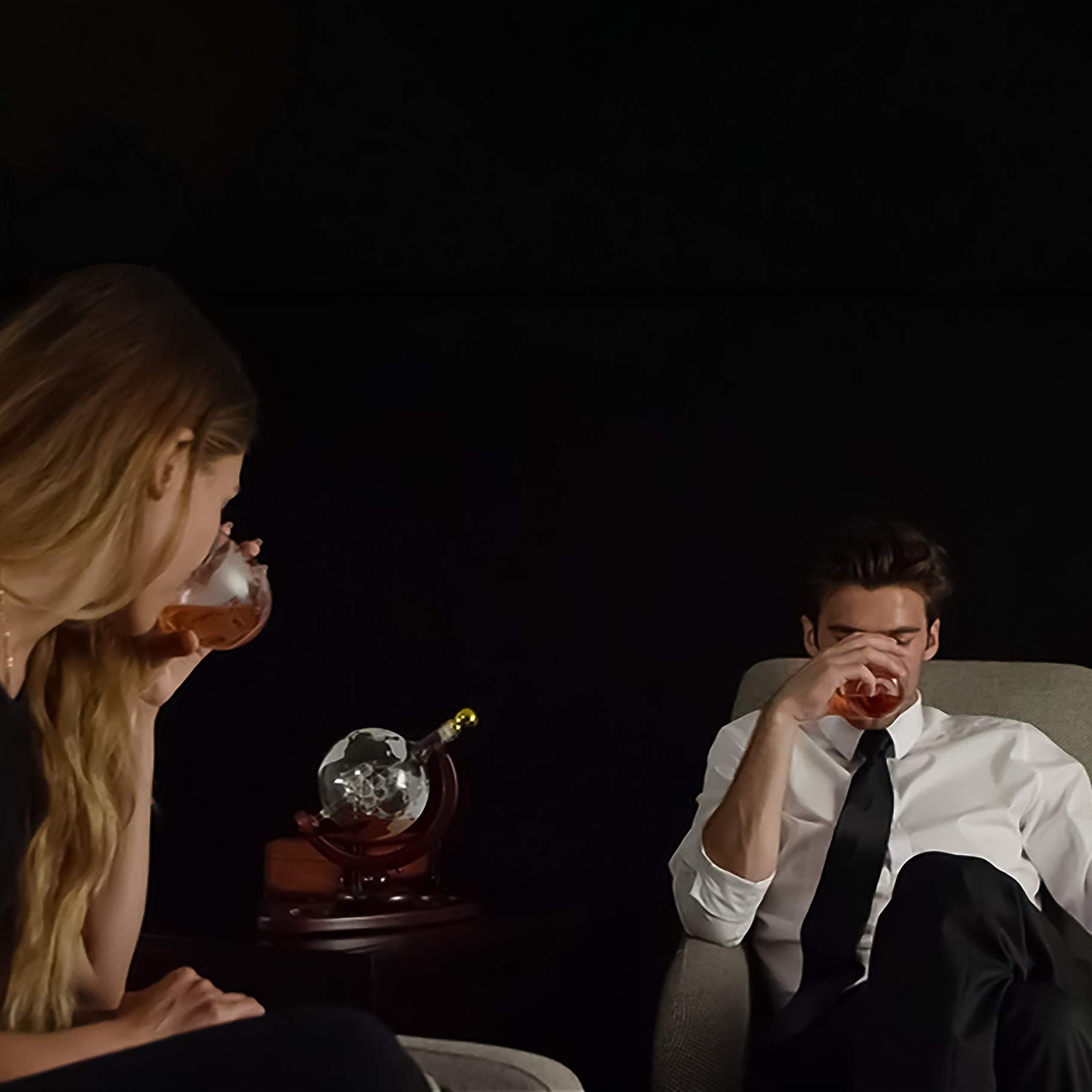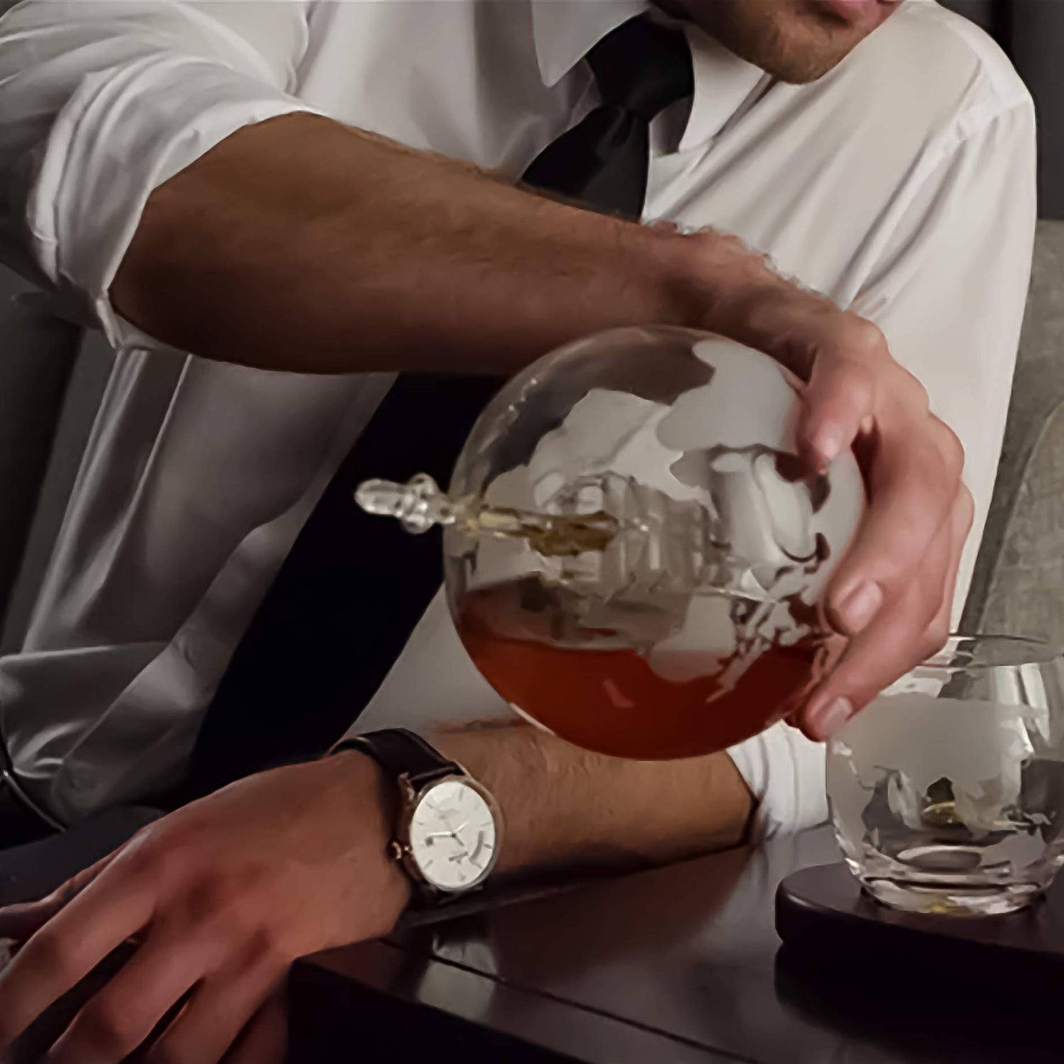 Our Meticulously hand blown whiskey decanter features an etched globe design and antique ship in the bottle that will undoubtedly enhance your drinking experience while making a bold impression.