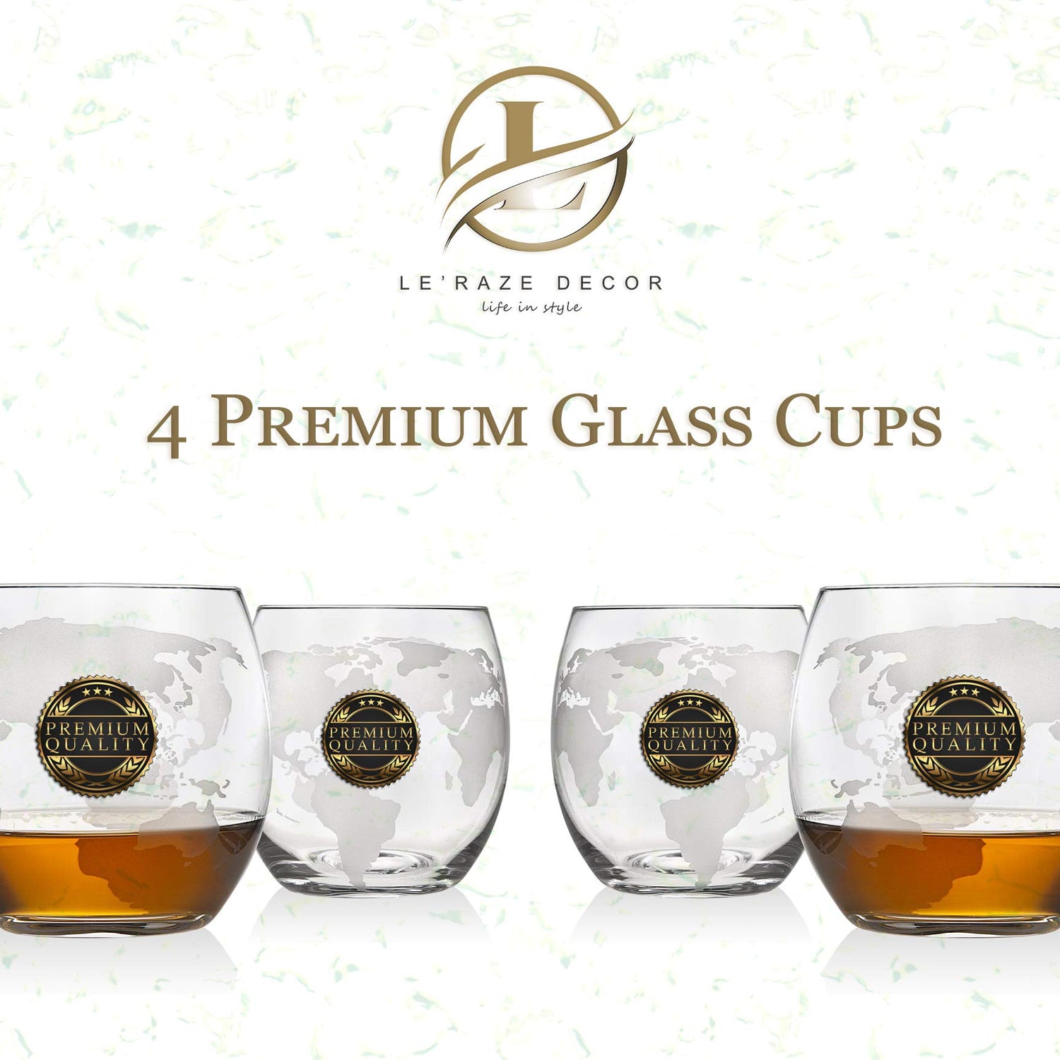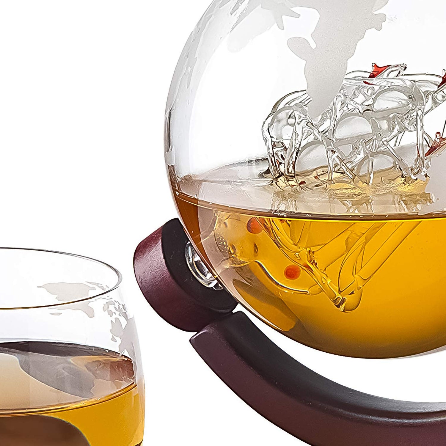 - BEAUTIFUL ARTISAN CRAFTED - This elegant lead free high quality globe decanter is entirely handmade. From the hand crafted wood stand to the hand-blown globe barrel glass decanter with unique antique ship indie and shot glasses to the mahogany wooden base of each matching bar glass - we pay attention to each detail so that each set can display beautifully in your home/bar or even office desk - This globe engravement will NOT fade over time -.