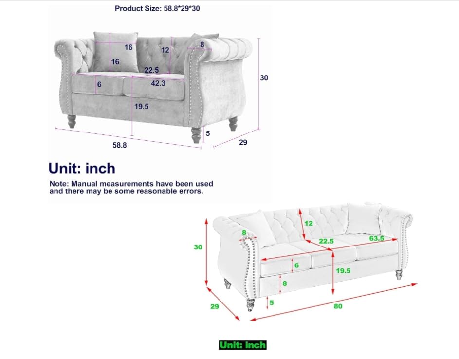 - 【The Loveseat +3 Seater classic Chesterfield sofa Set】Loveseat +3 Seater Velvet sofa Set is not only comfortable to sit, beautiful appearance, looking simple and generous, and fashionable temperament--Featuring the classic Chesterfield sofa design, it is classic and sophisticated. Perfect with any decorative theme, this sofa is the perfect choice for your living room, bedroom or office.(The cushions are compressed and take 48-72 hours to fill.)