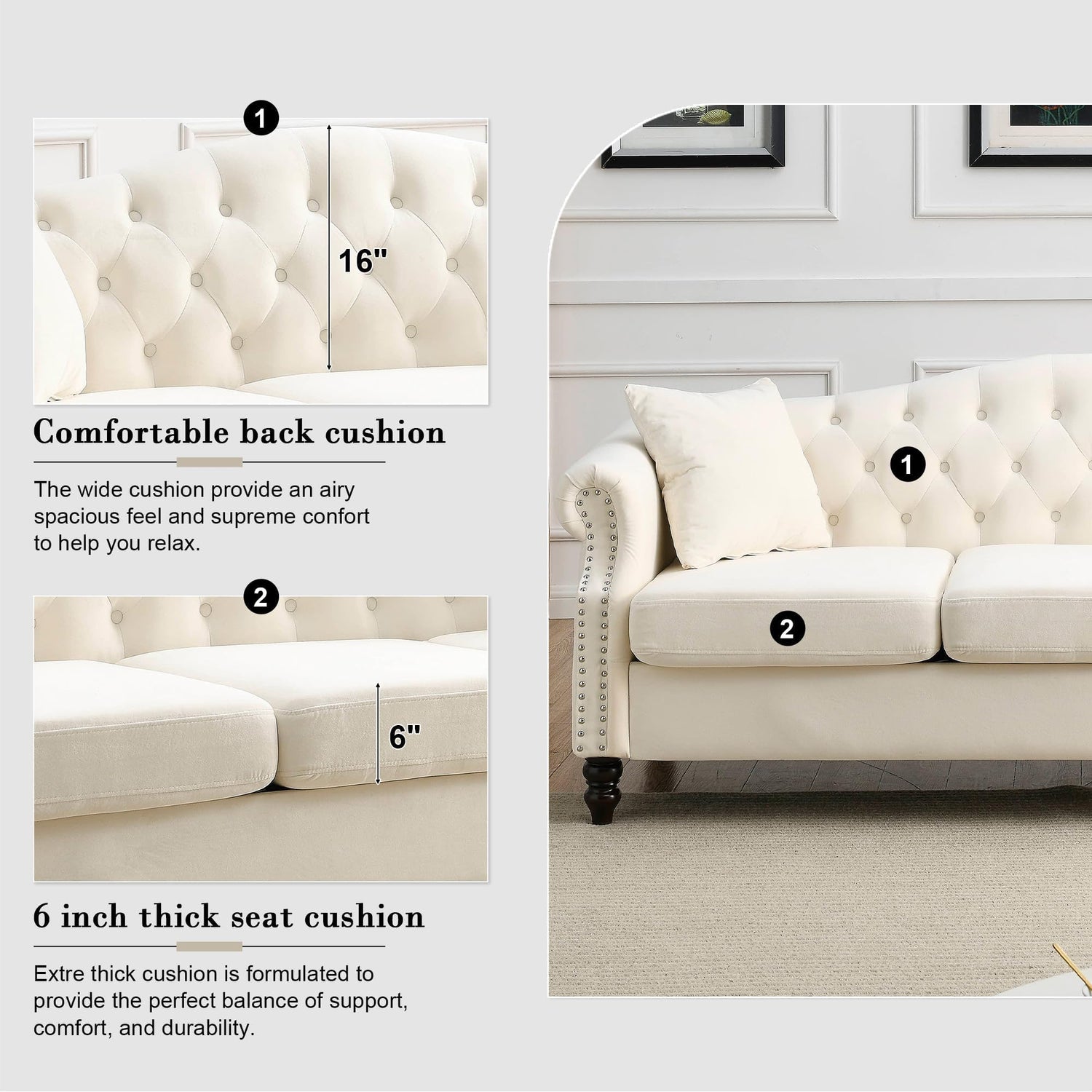 ATUMON 79" 2 Piece 3-Seater Velvet Chesterfield Sofa Couch for Living Room, Combination Sofa with 4 Pillows,Button Tufted Trimming Curved Backrest Rolled Arms with Black Legs, Beige
