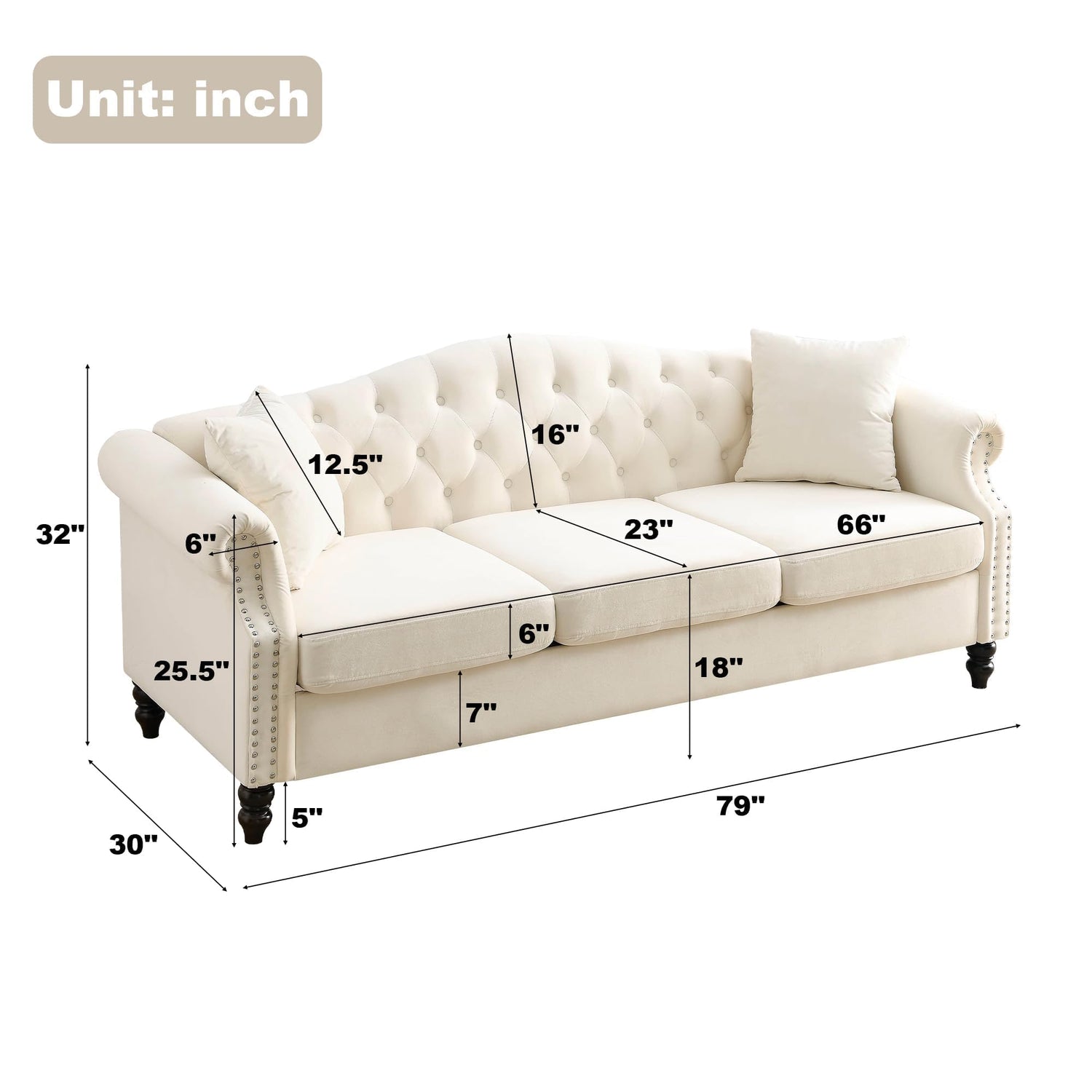 ATUMON 79" Chesterfield Sofa Couch for Living Room, 3-Seater Mid Century Modern Soft Velvet Tufted Sofa with Rolled Arms Nailhead & Two Pillows for Bedroom, Office & Coffee Bar, Beige