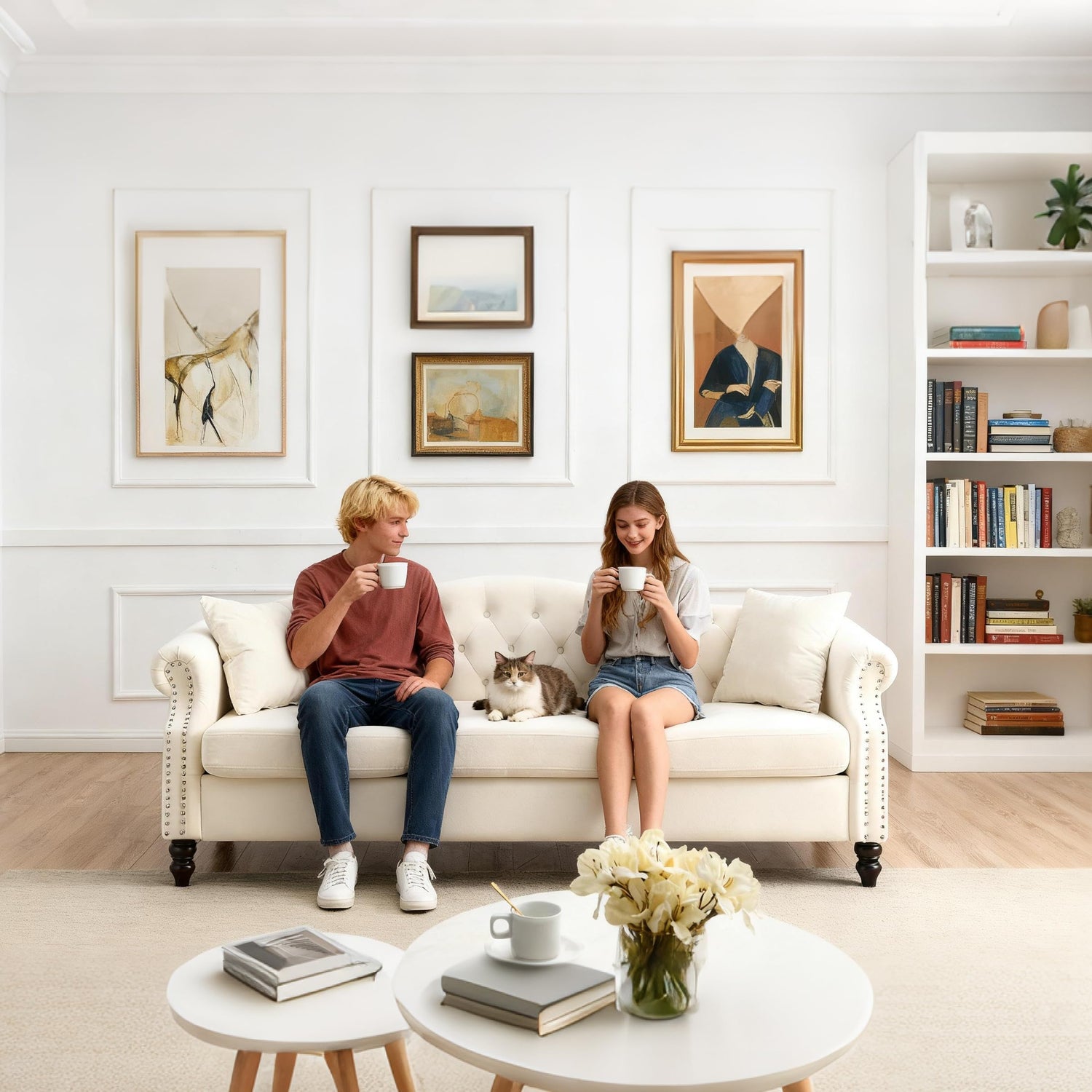 - 【Sturdy and durable】The frame of the couch is made of solid wood for added sturdiness and durability. With comfortable foam, soft cushions supported by a curved spring structure and tufted buttons on the back and arms, this sofa is perfect for those who want to rest after a busy day.