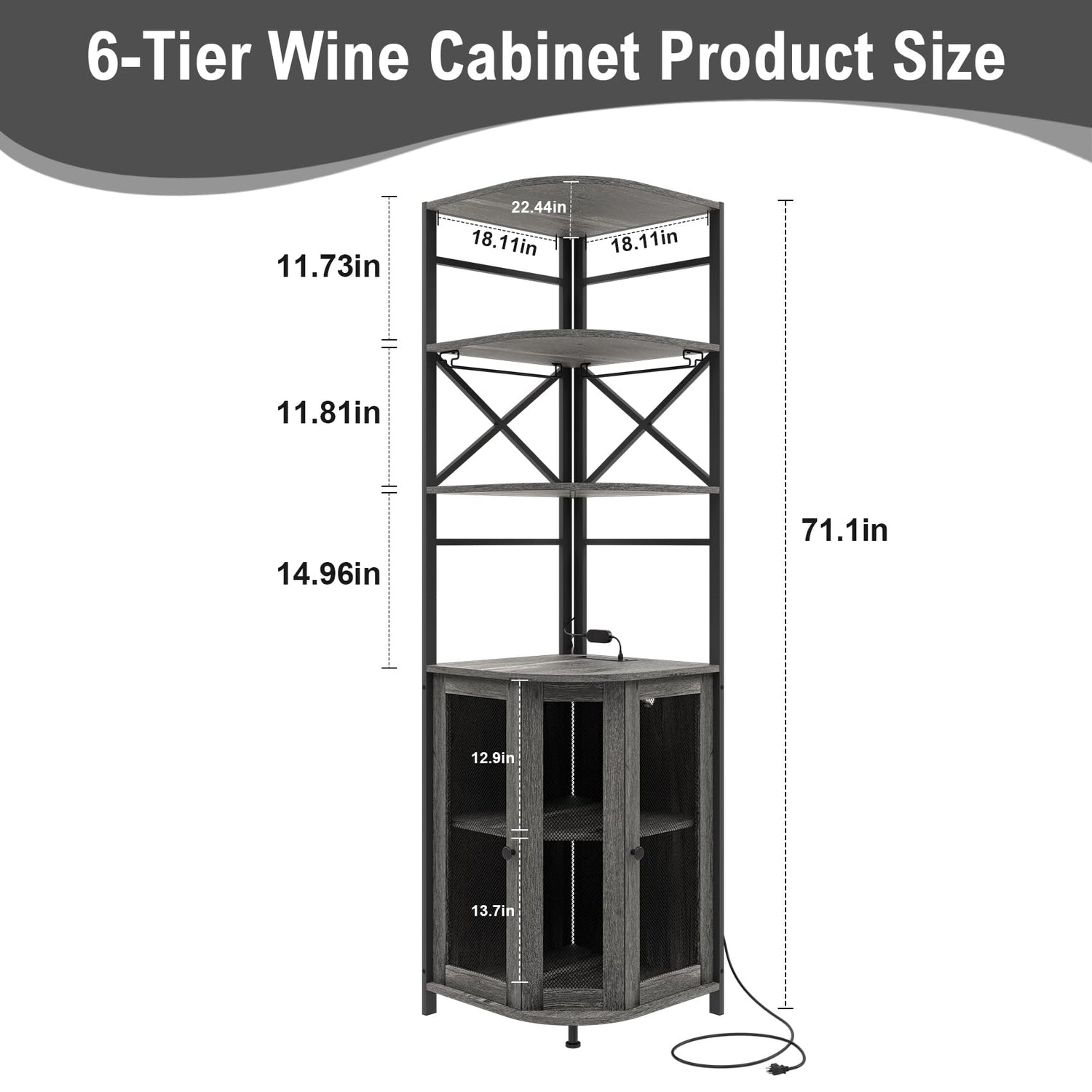 Aufvolr Wine Bar Cabinet with Power Outlet, 6-Tiers Industrial Wine Cabinet with LED Light and Glass Holder, Corner Bar Cabinet with Adjustable Shelf and Mesh Door, Liquor Cabinet Bar for Home