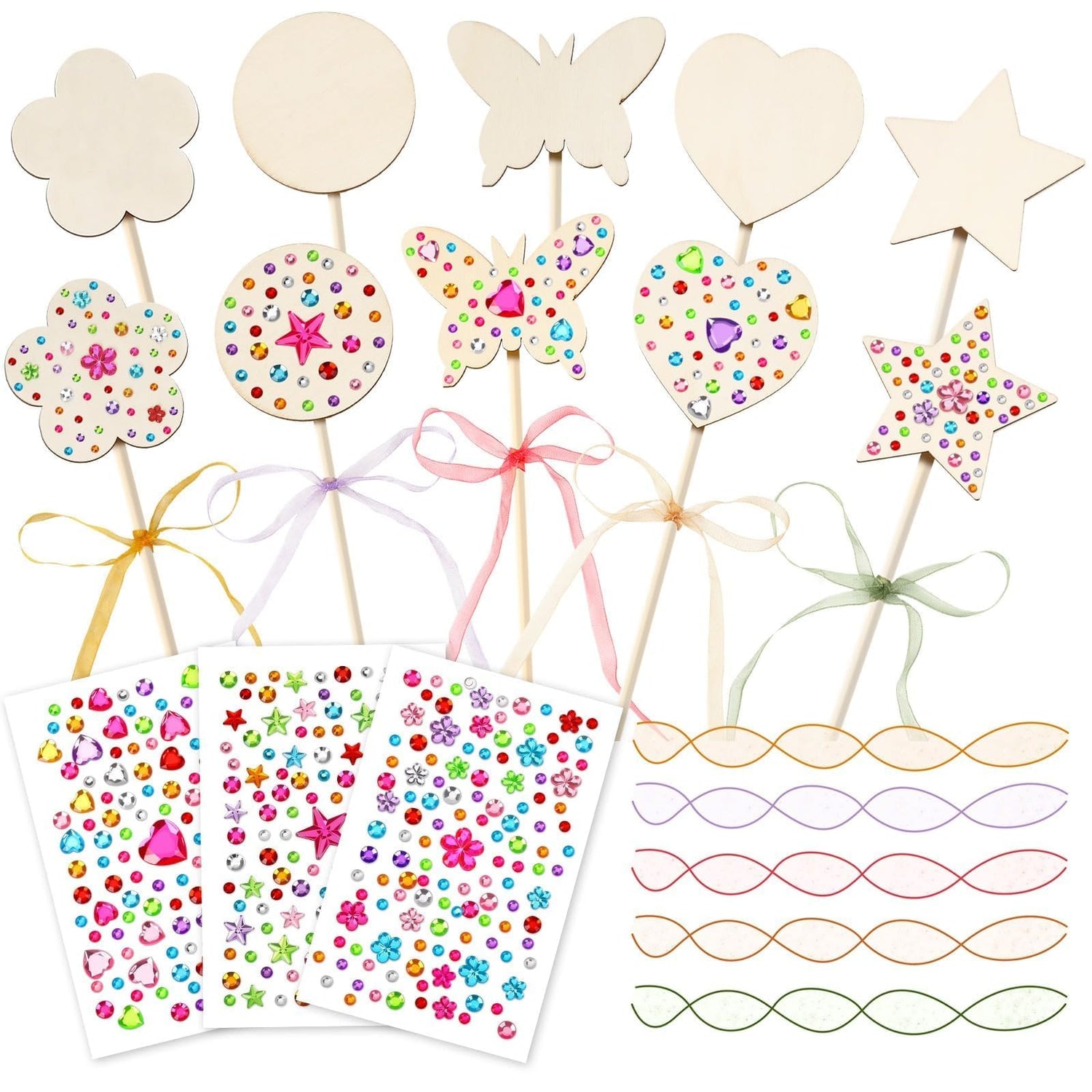 - Package Includes: You will receive 20 blank DIY magic wand in 5 different styles: heart, butterfly, star, round and flowe, with 4 magic wand for each style. 3 sheets gem stickers with different styles and colors and 20 colored ribbons, a total of 43 pieces. Various styles, sufficient quantity to meet your needs of various activities, and create your unique princess fairy wands
