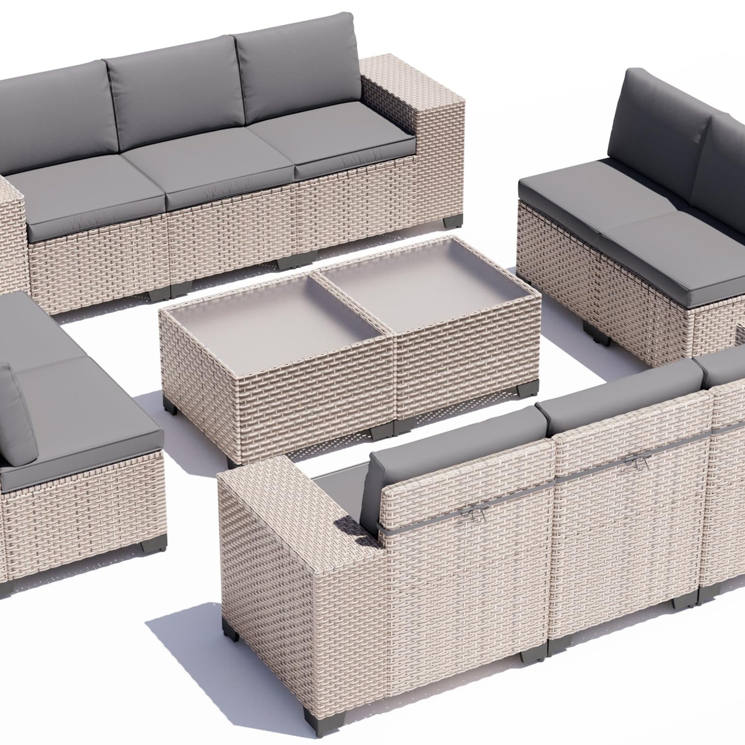- Multiple Placement: Aukreolis 12-piece patio furniture set balances functionality and aesthetics with a premium glass coffee table and extra-wide armchair. The seats can be secured to each other with snaps to meet your needs in a variety of scenarios