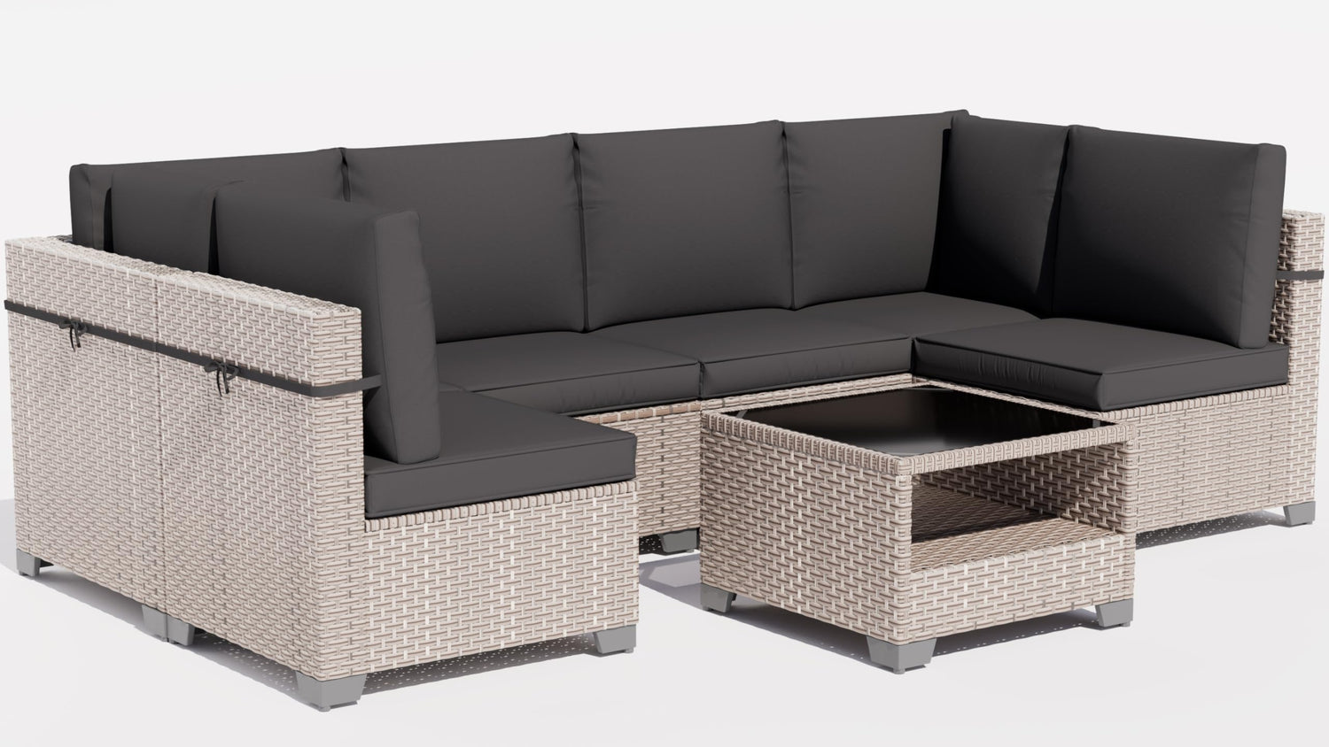 - Multiple Placement: Aukreolis 7-piece patio furniture set balances functionality and aesthetics with premium glass coffee table and corner armchair. The seats can be secured to each other with snaps to meet your needs in a variety of scenarios