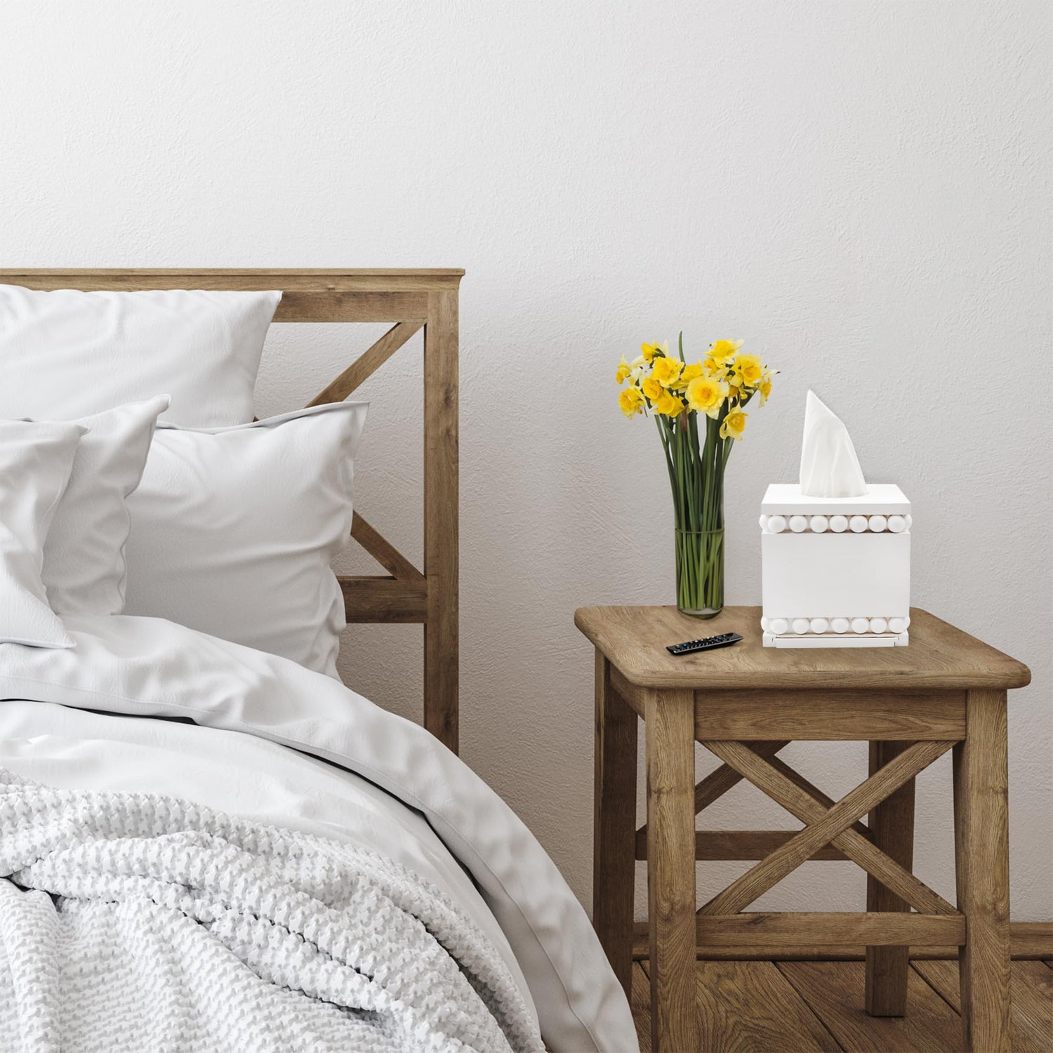 AuldHome Beaded Square Tissue Box Cover (White); Rustic Farmhouse Wood Tissue Holder