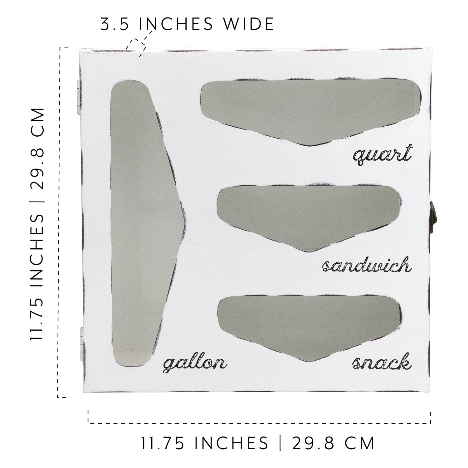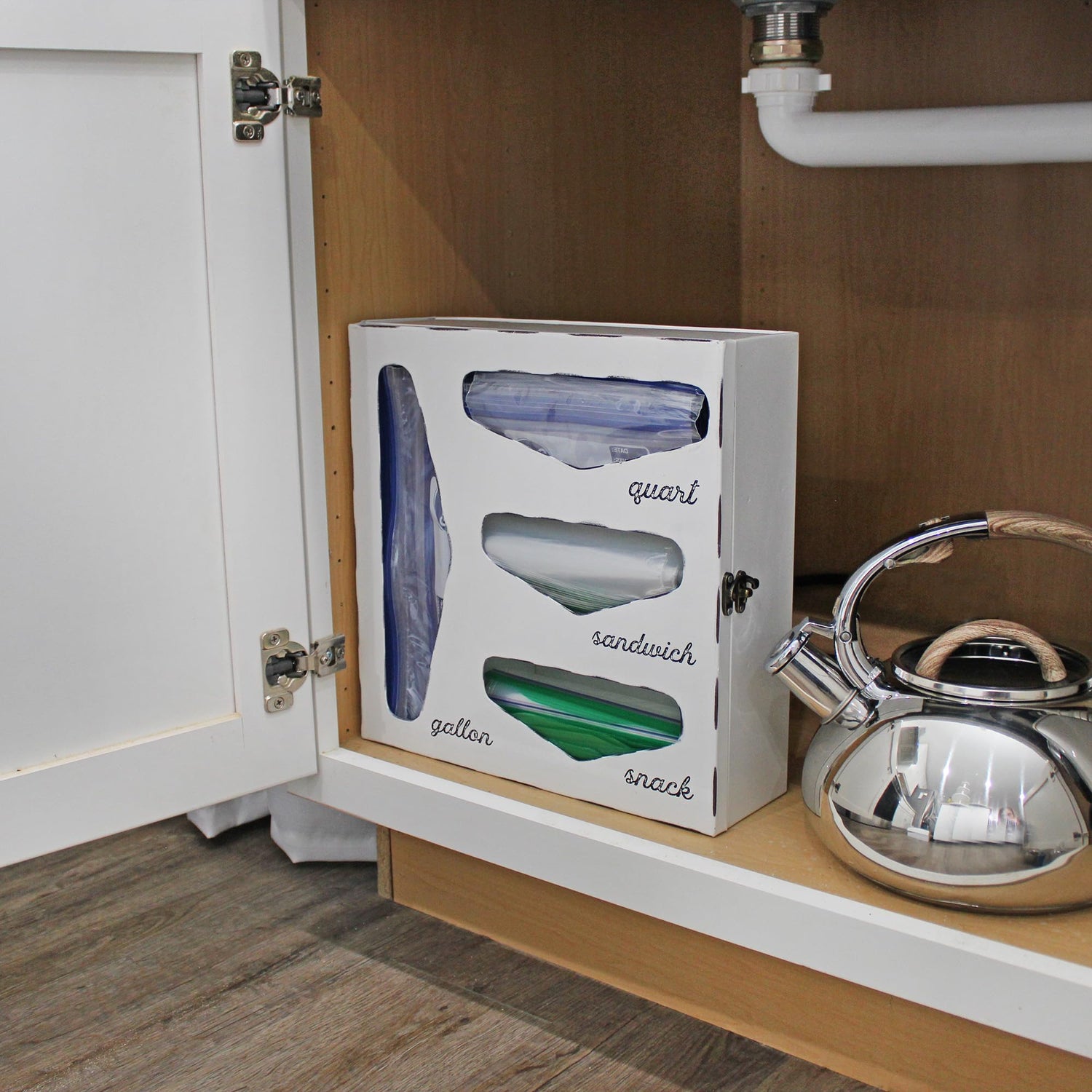 This divided box is specifically designed as a space saver for your pantry. Instead of having four separate boxes from the store, you can now use ONE box (with a lid) that has a dispenser opening for each bag size. Each opening is labeled for the correct bag size: Gallon, quart, sandwich, and snack. The storage container box is stylish in white enamel over metal with black script. There are two holes in the back of the box for easy wall-mounting. You can also mount this box to your cabinets or pantry door for convenience. It will also stand vertically so you can use it on your countertop. Cute, durable, and space-saving.