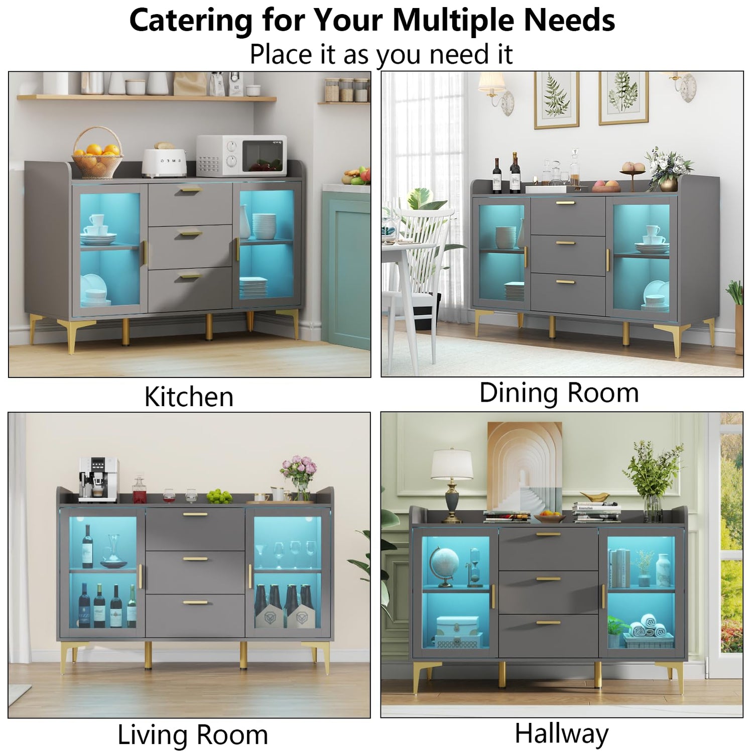 - 【LED Lights & Glass Doors】Enhance your dining experience with this buffet cabinet featuring an LED light strip and glass cabinet doors. The LED lights create a mesmerizing ambiance and enhance visibility, making it easier to locate and select your preferred items. The glass doors allow you to showcase items while protecting them from dust and maintaining their optimal conditions. The LED Lights combined with the glass doors create a visually appealing display for your items.
