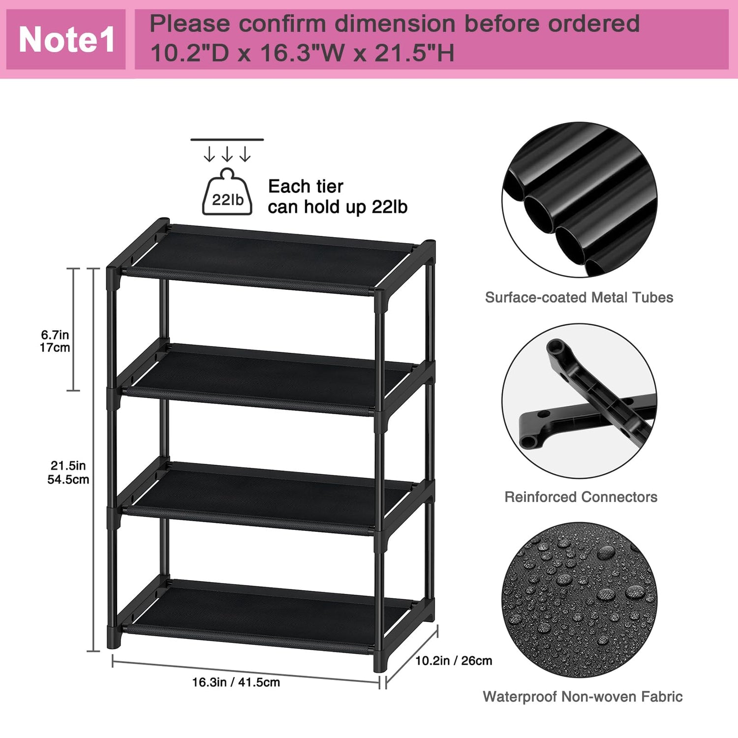 - [4 Tier Black Shoe Rack] Free standing shoe rack is made of sturdy waterproof non-woven fabric layer, reinforced plastic connectors and black thickened metal tubes. Simple structure, but strong load-bearing capacity and good stability. Size:16.3"X10.2"X21.5"