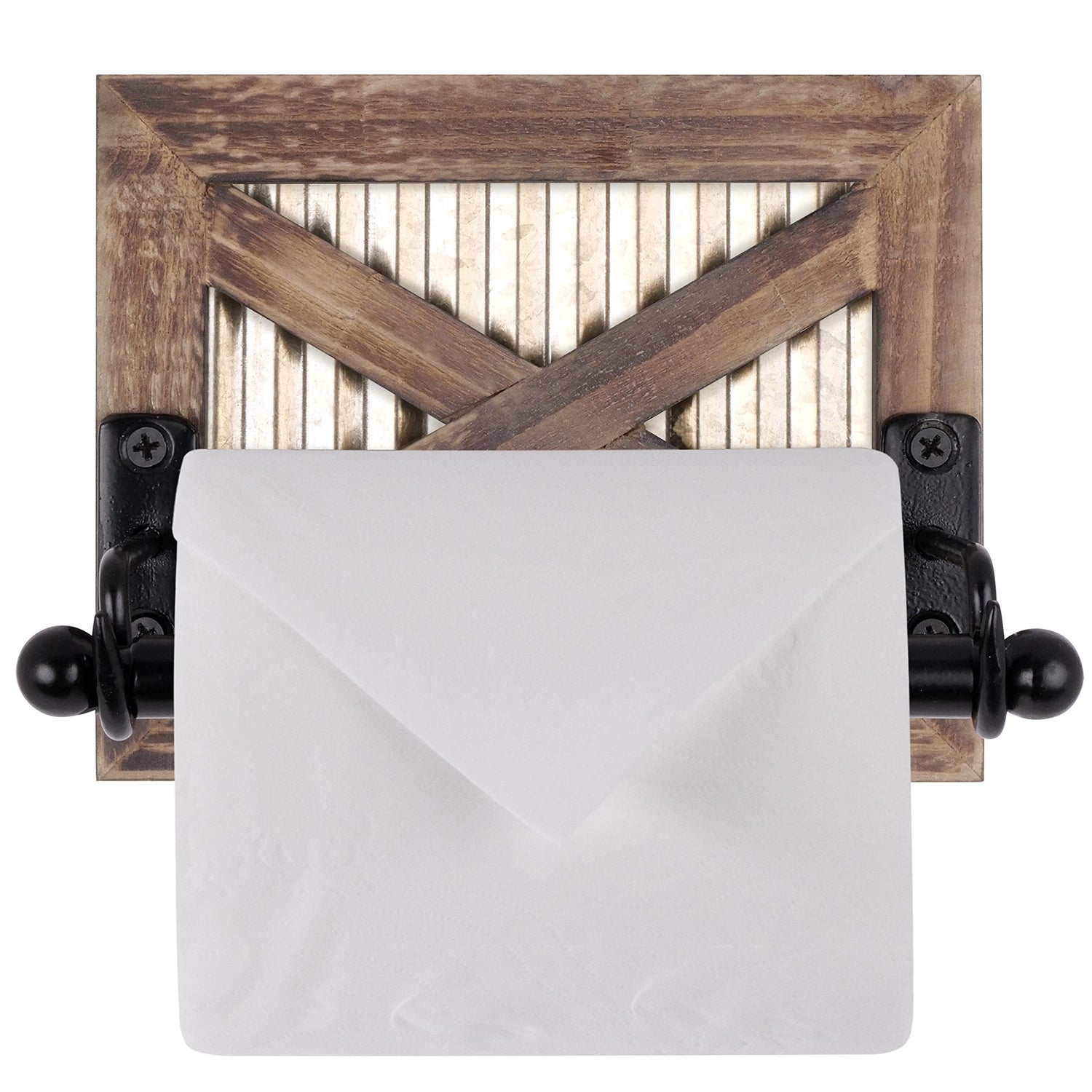 Autumn Alley Rustic Farmhouse Barn Door Toilet Paper Holder | Constructed of Warm Brown Wood, Gold Corrugated Metal and Black Metal | Adds Functional Farmhouse Charm to Your Bathroom
