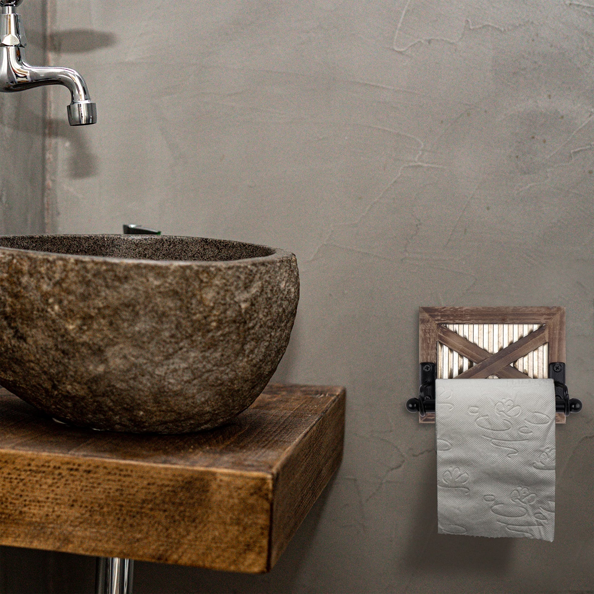 Details: This fun and unique toilet paper holder will add that warm county farmhouse feel to your bathroom. The cool metals paired with the warm wood really makes this holder a stand out. Pair it with our barn door shelf and towel rack for even more farmhouse flair.