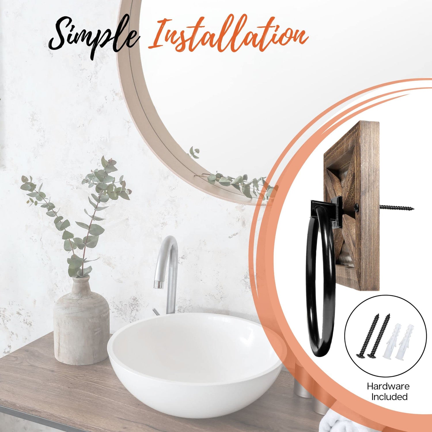Autumn Alley Rustic Farmhouse Towel Holder for Bathroom, Rustic Hand Towel Holder, Rustic Towel Rack Holder, Wall Mounted, Western Bathroom Decor, Wood Country Decor, Galvanized Metal, Black Ring