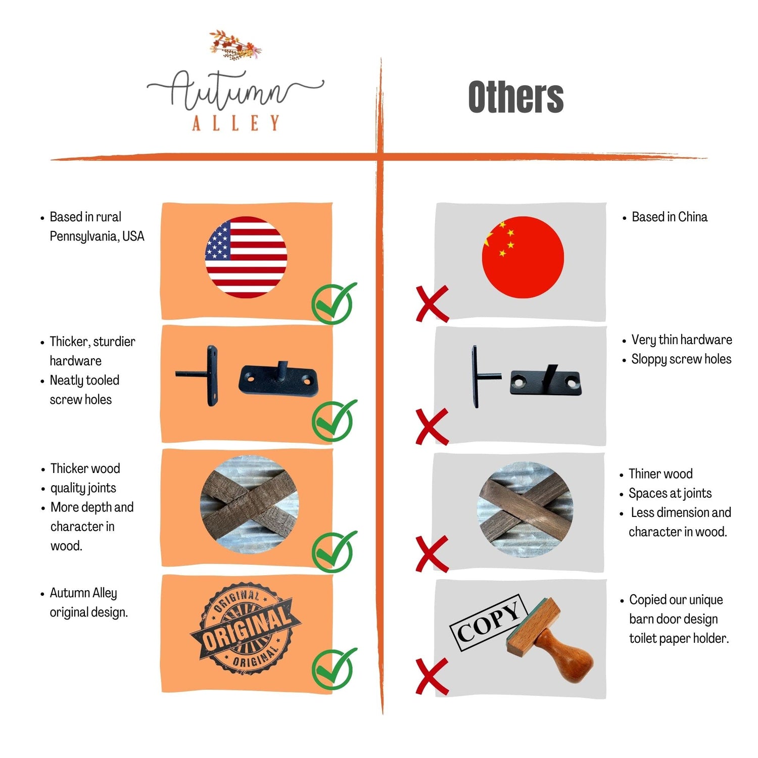 - Secure, Durable, and Upgraded Brackets - Our farmhouse tp holder's deeper brackets allow for a more solid crossbar, securely holding the roll in place. Autumn Alley farmhouse bathroom toilet paper holder is expertly crafted with exceptional features that make changing rolls a breeze.