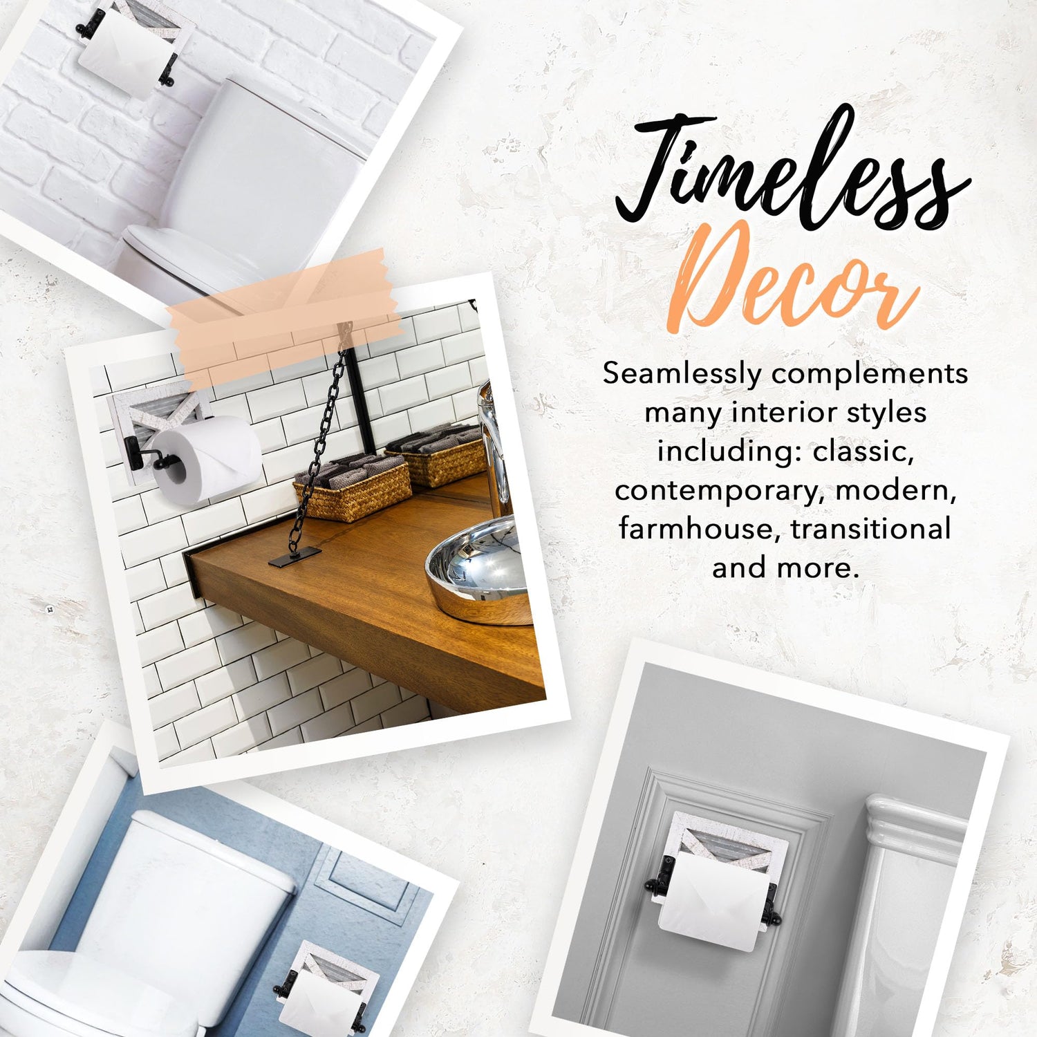 Details: AUTUMN ALLEY FARMHOUSE TOILET PAPER HOLDER The Autumn Alley Rustic Barn Door themed Toilet Paper Holder is an exceptionally functional and timeless piece of bathroom decor that will make a great addition to your home. CHARM IS IN THE DETAILS - Finished in warm white washed wood, this farm toilet paper holder adds the rustic charm into your home without overpowering it - Galvanized corrugated metal sheet and black metal brackets enhance the appeal of this country toilet paper holder - Barn door motif and weathered white wood accentuate the countryside feel of this rustic paper roll holder naturally - Perfect size of 6.25 in x 5 in x 3.5 in is not only ideal for holding toilet paper rolls but even from aesthetic point of view. STURDY & DURABLE BUILD - Rustic farm bathroom accessories do not need to have corroded surfaces, sharp corners or flimsier build - Designed using solid wood, high quality sturdy metal sheet which is resistant to rust/corrosion, and black metallic brackets & crossbars which add a contemporary element to design, our old-fashioned toilet paper holder can help reinvent your décor - World-class craftsmanship that reflects in every piece of this country bathroom hardware